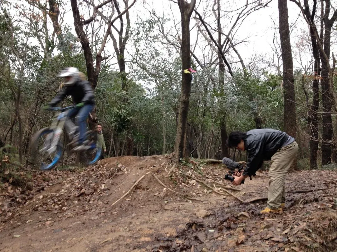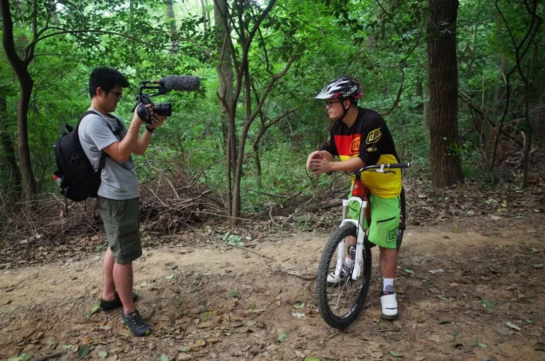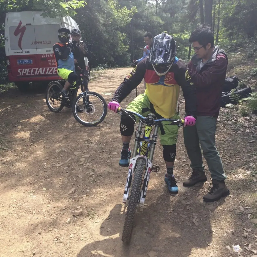 速降这项运动顾名思义,要从高往低处冲,除了单车需要特殊的构造,还要车手过硬的技术和胆量以及对比赛场地的熟悉度,当年的紫金山后山还是很荒凉的,基本上没有人,胖乐和标哥还有店长小赵,在那里手工搓出了一条赛道,这件事现在看起来都是不可思议,用一些沙袋、树枝、木板一点点的拼凑起来,跳台飞包该有的都有,从起点到终点整个赛道都相当有挑战。