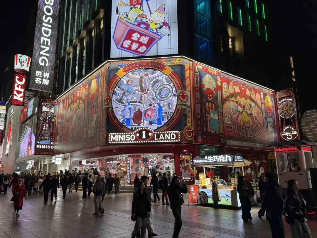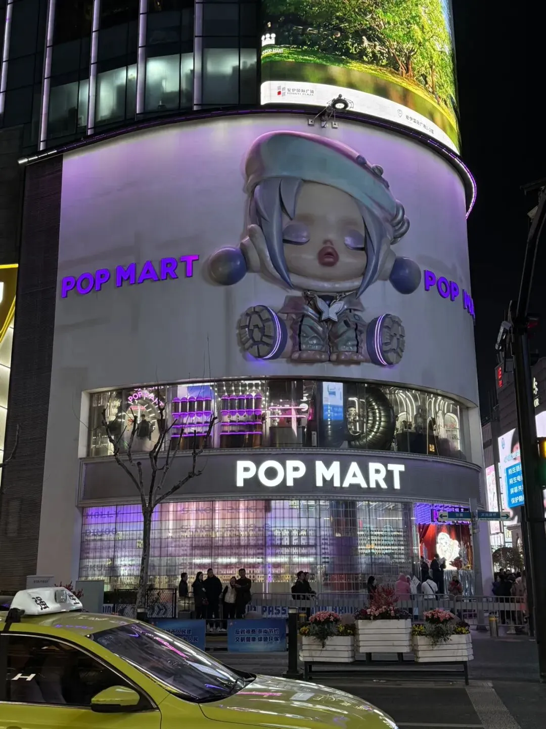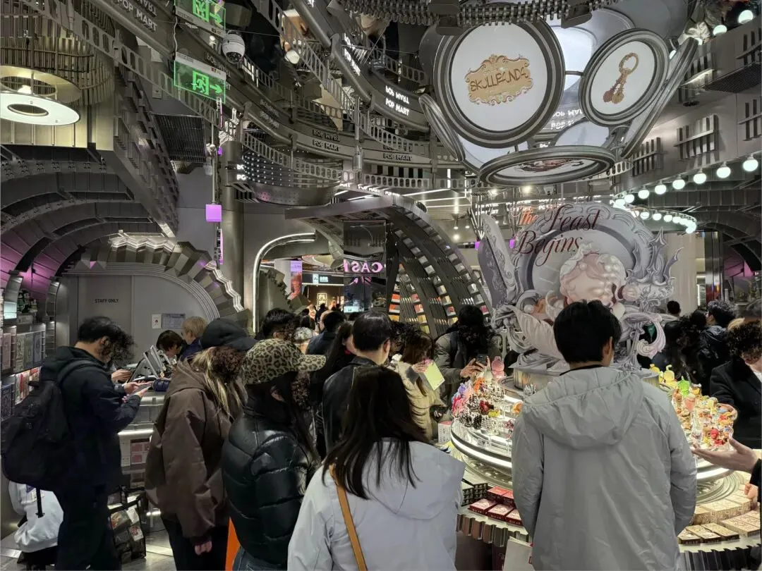 接着去POP MART泡泡玛特(全球旗舰店),在十字路口,对面是apple南京东路店。泡泡外立面是skullpanda,由于店内面积限制略显凌乱,但人气很旺。