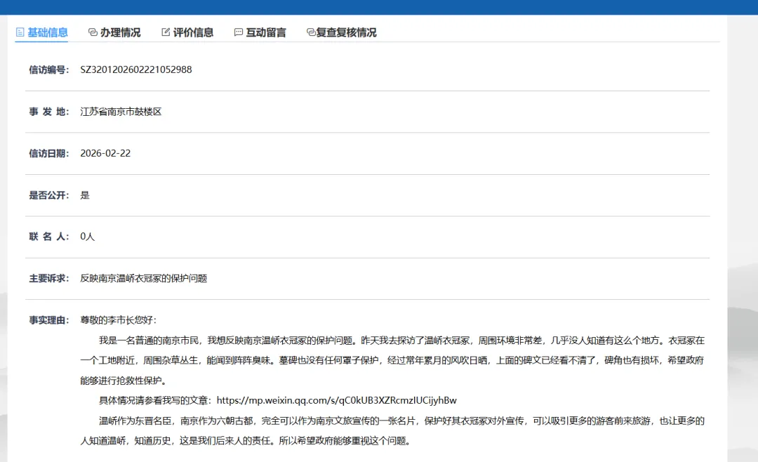 ,看到温峤衣冠冢的破败情景,心中意难平,回来我就在南京市长信箱进行意见反馈。我这人也好管闲事,市长信箱我也写过好几次意见反馈,记得2011年我曾为南京黄伯韬将军的墓地修缮保护给季建业写过信,后来去明岐阳王陵园里看过几次,黄伯韬将军墓地后来修缮的不错,所以我也抱着同样的态度针对温峤衣冠冢的修缮保护提了类似的建议。