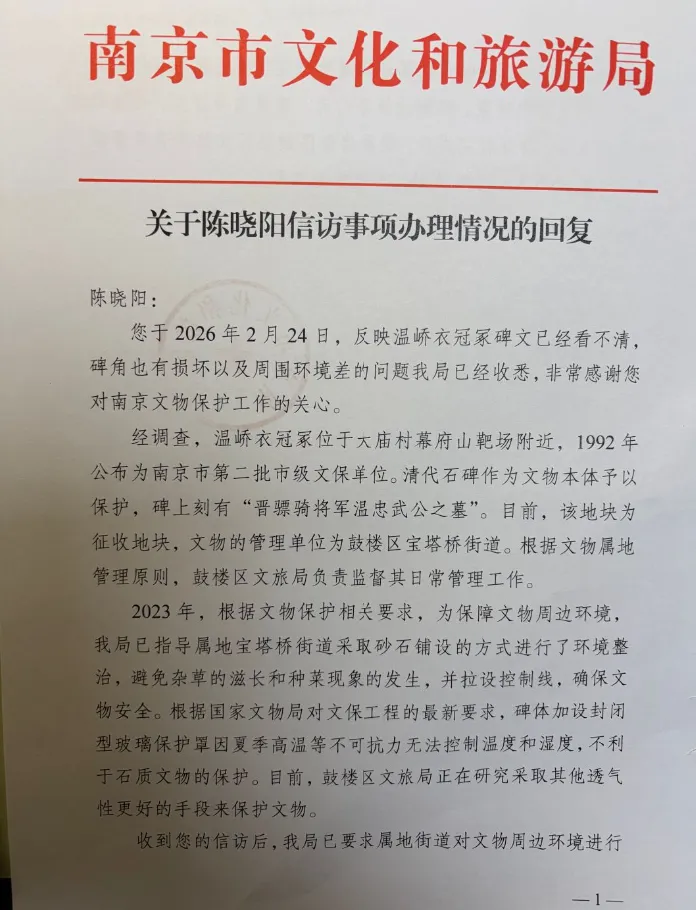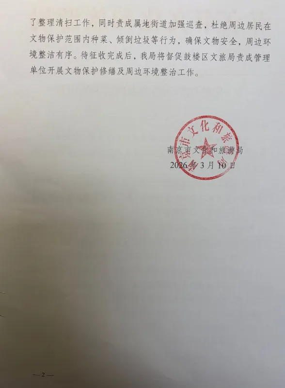 今天下班收到南京文旅局寄过来的快递,拆开一看是给我的答复,总体来说我还是比较满意的,起码文旅局回应并给出了相应的保护措施。作为一名南京市民,