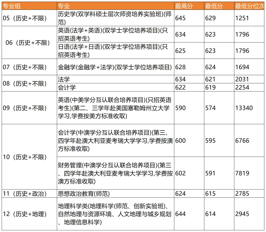 1. 英语(中美学分互认联合培养项目)—13340;2. 财务管理(中澳学分互认联合培养项目)—7819;3. 会计学(中澳学分互认联合培养项目)—6766。最高录取位次专业为历史学(双学科硕士层次师资培养实验班),录取位次1251;录取位次最高的前三专业:1. 历史学(双学科硕士层次师资培养实验班)—1251;2. 金融学(金融学+法学)(双学士学位培养项目)—1694;3. 英语(法学+英语)(双学士学位培养项目)—1796。