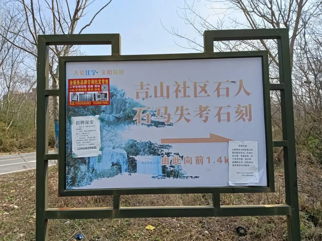 导航要走两公里。陌生的道路,去的时候都会感觉很远,回来就不远了。吉山路,两边都是企业,小区,山庄,却看不到人,很僻静。爬坡,岔路口竟然有路标,吉山石刻还有1.4公里。几张广告搭便车,后来在村里看见最多的是租房广告。