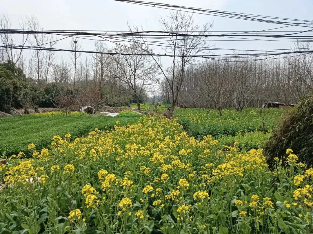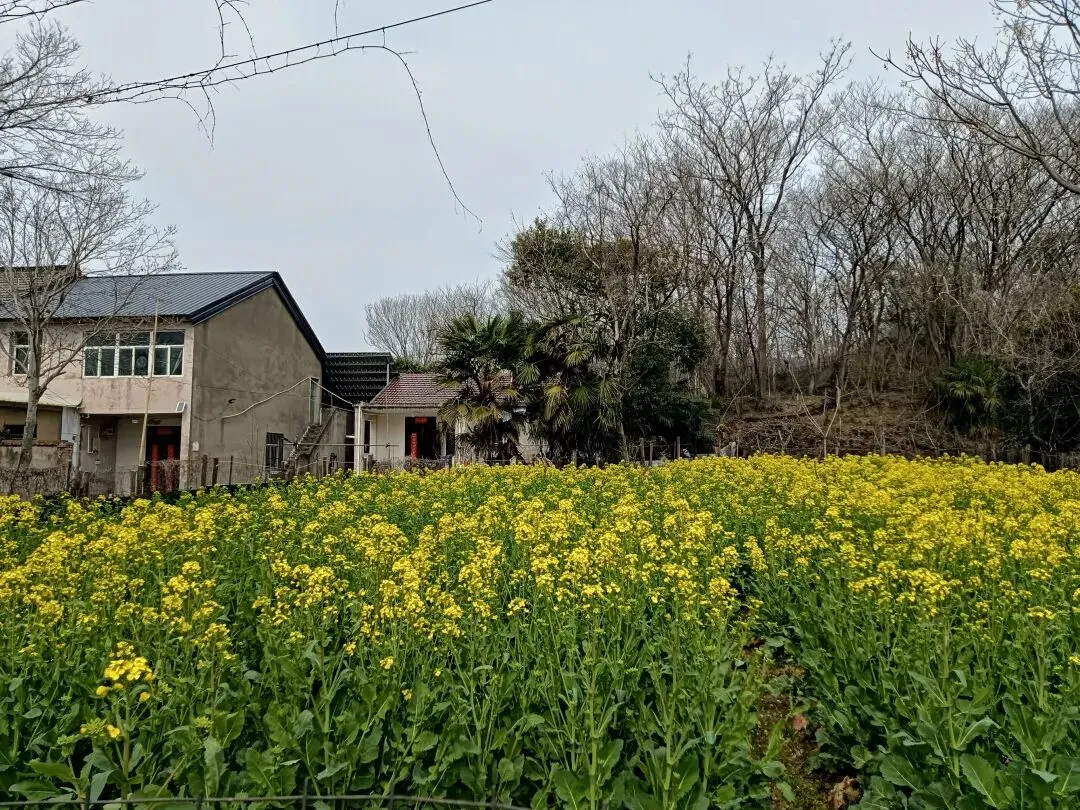 进村还有一公里。路两边,山坡上,房前屋后,油菜花灿烂。