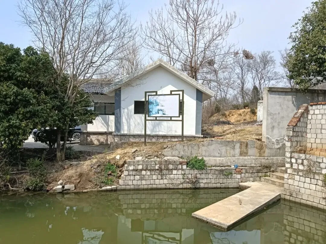 岔路口有一个水塘,边上立着第四块路牌,已经看不清了。后面好像是公共厕所。
