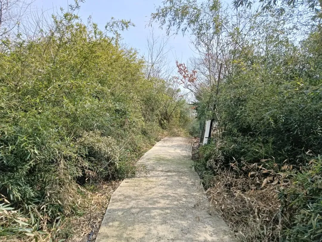 前方黄色岔路口路标,就要往右拐,走小路穿过竹林。