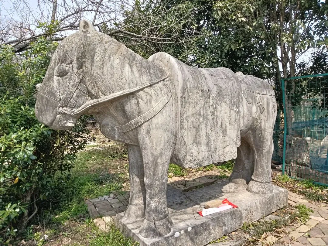 院子里还有一匹石马,四蹄与基座采用整石雕凿。高2.5米,长3.2米,体态丰腴,手法写实,是宝马良驹之态。该石刻体量较大,雕刻技艺精湛,花卉图案繁而细腻,极具历史和艺术价值。