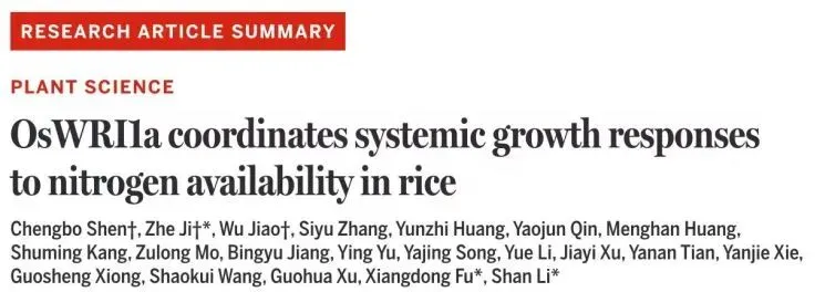 2026年2月26日,南京农业大学李姗教授团队联合中国科学院遗传与发育生物学研究所傅向东院士和英国牛津大学吉喆博士,在Science发表题为OsWRI1a coordinates systemic growth responses to nitrogen availability in rice的研究论文,首次系统解析了水稻在低氮环境下实现根-冠协同发育的分子机制,并鉴定出可同步提升氮肥利用效率与产量的OsWRI1a优异单倍型,为“减肥增效”型水稻育种提供了重要的理论创新与基因资源。