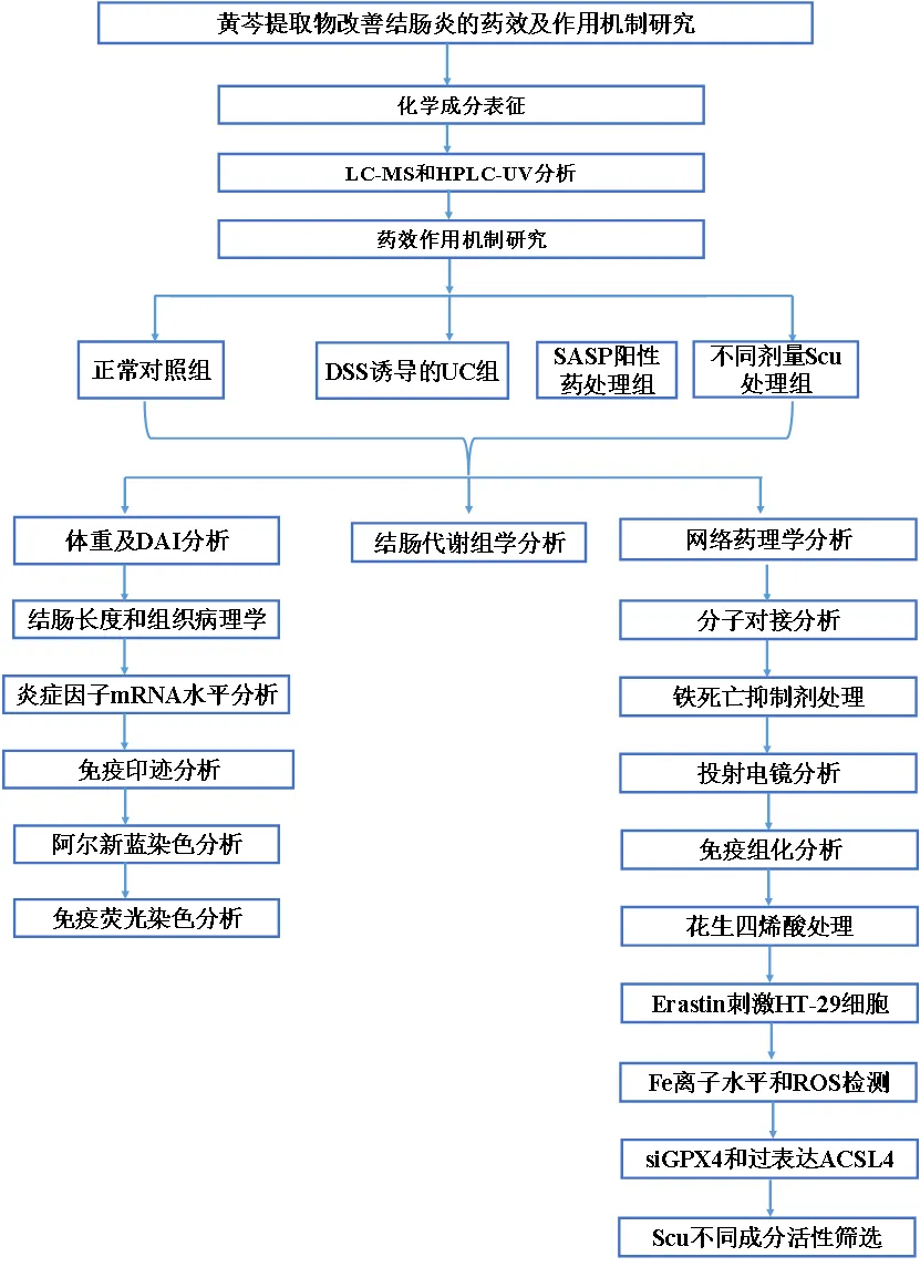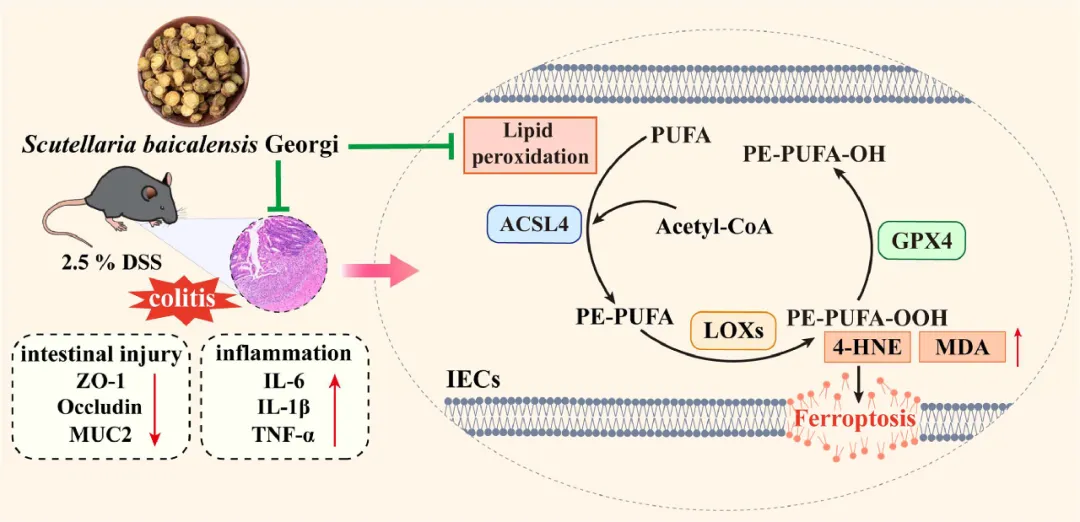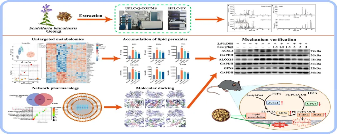 结肠上皮细胞铁死亡与溃疡性结肠炎(UC)的发展和随之而来的肠漏有关。黄芩(Scu)是一种广泛用于缓解UC的草药。本研究旨在阐明Scu通过抑制肠上皮细胞铁死亡对UC的治疗作用,并探讨其对脂质过氧化和GPX4/ACL4通路的调节机制。研究者采用UPLC-Q-TOF/MS分析草药提取物中的化学物质和Scu给药小鼠原型成分的结肠暴露情况;此外,研究者使用HPLC-UV对主要化合物进行了定量;在通过喂食右旋糖酐硫酸钠(DSS)建立的UC小鼠模型中全面探索了Scu的改善作用;基于HPLC-MS的代谢组学研究旨在鉴定Scu治疗UC小鼠结肠组织中的差异代谢物;网络药理学用于靶点预测和潜在通路分析。结合这些生物信息学分析,RT-qPCR、免疫荧光、免疫组织化学和免疫印迹用于阐明Scu在体内和体外模型中对铁死亡相关途径的调节机制。研究者对Scu中的78种化学成分进行了表征,其中42种在Scu小鼠的结肠组织中检测到。Scu可以缓解小鼠UC相关症状,包括结肠长度增加和病理评分降低。此外,Scu抑制了促炎细胞因子和介质,同时通过在mRNA和蛋白质水平上增加ZO-1和Occludin的表达来改善肠道屏障功能。基于代谢组学研究,共有71种差异代谢物在Scu给药后表现出逆转趋势。这些发现结合网络药理学的结果,表明花生四烯酸(AA)代谢和铁死亡可能是Scu干预UC的潜在途径。研究者进一步的实验表明,Scu对铁死亡的改善作用部分归因于其对脂质过氧化的调节及其对GPX4/ASCL4轴的调节作用,从而改善UC。当AA与Scu同时给药时,Scu对铁死亡、GPX4/ASCL4轴的调节作用及其对UC的保护作用显著降低。此外,当在体外敲除GPX4或过表达ACSL4时,Scu对铁死亡的抑制作用减弱。因此,Scu对UC的改善作用与调节脂质过氧化和GPX4/ASCL4介导的肠上皮铁死亡密切相关。