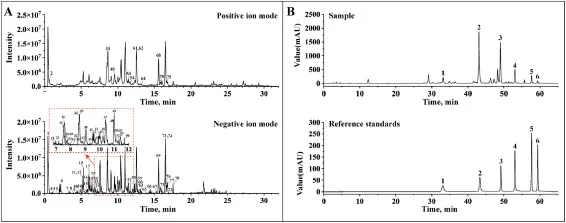 图1 Scu提取物的化学特征和主要成分的含量。(A)Scu提取物的总离子色谱图(TIC)。(B)Scu提取物和参考标准品的HPLC-UV色谱图。1,野黄芩苷;2,黄芩苷;3,汉黄芩苷;4,黄芩素;5,汉黄芩素;6,木蝴蝶素A。