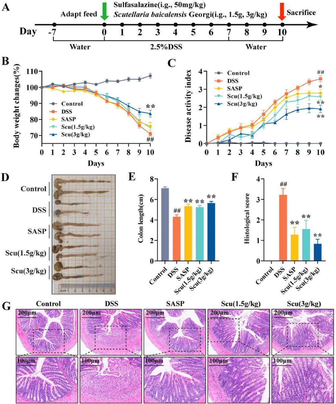图2 改善DSS诱导的结肠炎小鼠的Scu(n=8)。(A)小鼠给予2.5%DSS 7天以建立UC模型,并分别用SASP(50mg/kg)和Scu(1.5g/kg,3g/kg)治疗。(B)小鼠体重的变化。(C)疾病活动指数(DAI)评分。(D)结肠组织的宏观图像。(E)结肠长度。(F)组织学评分。(G)结肠组织的典型H&E染色。结果以平均值±SEM表示。与对照组相比,##P<0.01;与DSS组相比,*P<0.05和**P<0.01。