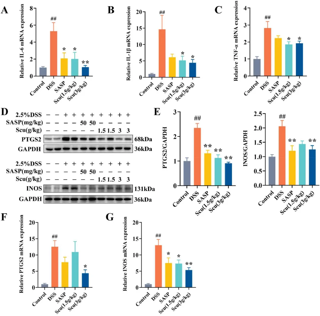 图3 Scu改善UC小鼠的结肠炎。(A-C)采用RT-qPCR检测结肠组织中IL-6、IL-1β和TNF-α的相对mRNA表达(n=6)。(D-E)免疫印迹检测结肠组织中iNOS和PTGS2的蛋白表达(n=3)。(F-G)采用RT-qPCR检测结肠组织中INOS和PTGS2的基因表达(n=6)。结果以平均值±SEM表示。与对照组相比,##P<0.01;与DSS组相比,*P<0.05和**P<0.01。