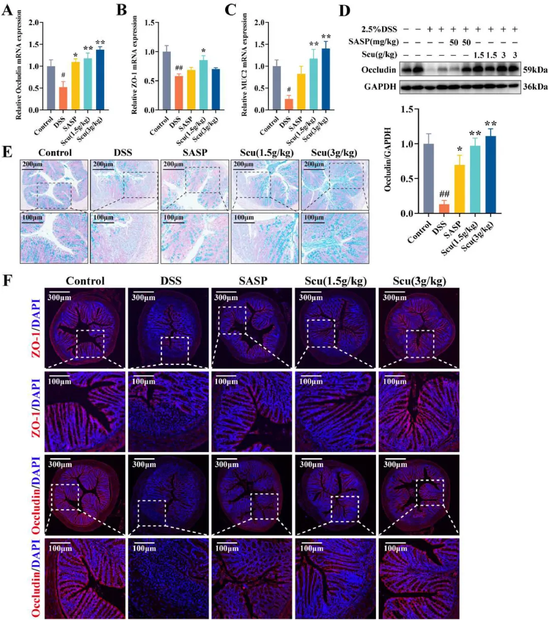 图4 Scu修复UC小鼠上皮损伤。(A-C)结肠组织中Occludin、ZO-1和MUC2的mRNA表达(n=6)。(D)不同组(n=3)结肠组织中Occludin的免疫印迹。(E)不同组别小鼠的结肠阿尔新蓝染色图像。(F)结肠组织切片中Occludin和ZO-1的免疫荧光组织化学染色。结果以平均值±SEM表示。与对照组相比,#P<0.05和##P<0.01;与DSS组相比,*P<0.05和**P<0.01。
