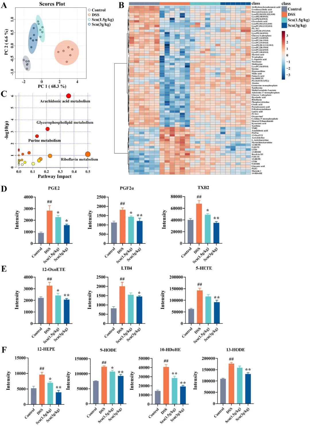 研究者分析了这些来源于AA的不同脂质过氧化物。与对照组相比,DSS组的PGE2、PGF2α和TXB2的EIC强度显著升高。在LOX途径的代谢产物中,DSS组的12-羟基二十碳四烯酸(12-OxoETE)、白三烯B4(LTB4)和5-羟过氧化二十碳四烯酸(5-HETE)的强度也显著升高。在Scu(1.5 g/kg,3 g/kg)组中,所有这些代谢物都显著降低(图5D,E)。此外,研究者通过LOX途径从其他脂质中提取的一些脂质过氧化物也表现出类似的趋势(图5F)。总之,研究者的研究表明,Scu主要通过调节UC小鼠结肠组织中PUFA的代谢来抑制脂质过氧化物的产生。