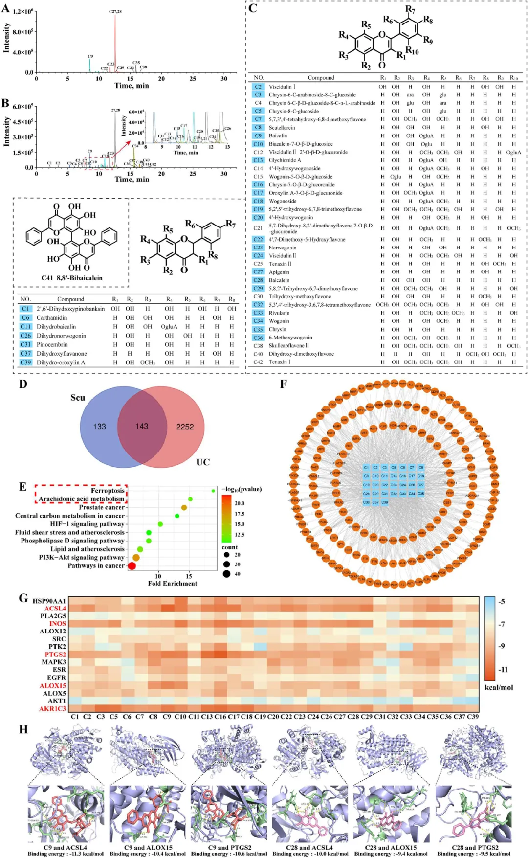 Scu是一种被广泛认可的草药,含有多种黄酮类化合物。为了阐明其抗UC作用的物质基础及其独特的作用方式,了解其作用机制至关重要。研究者进一步分析了结肠组织中Scu的暴露化合物,并进行了网络药理学分析,以预测Scu对抗UC的潜在机制。结果表明,Scu可能通过调节铁死亡和AA代谢途径干预UC。此外,分子对接研究表明,Scu中的某些化合物对与脂质过氧化和铁死亡相关的蛋白质表现出很强的亲和力。