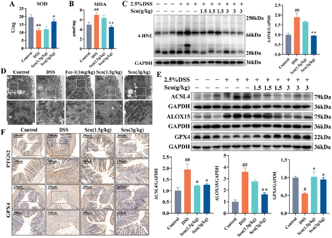 图7 Scu缓解DSS诱导的结肠炎小鼠结肠上皮细胞铁死亡,调节GPX4/ACL4轴。(A)SOD的水平。(B)MDA水平。(C)4-HNE修饰的蛋白质在不同UC治疗组中的分布。(D)结肠组织的代表性TEM图像。(E)ACSL4、ALOX15和GPX4的蛋白表达。(F)结肠中PTGS2和GPX4的代表性免疫组织化学图片。结果以平均值±SEM表示。与对照组相比,#P<0.05和##P<0.01;与DSS组相比,**P<0.05和**P<0.01。
