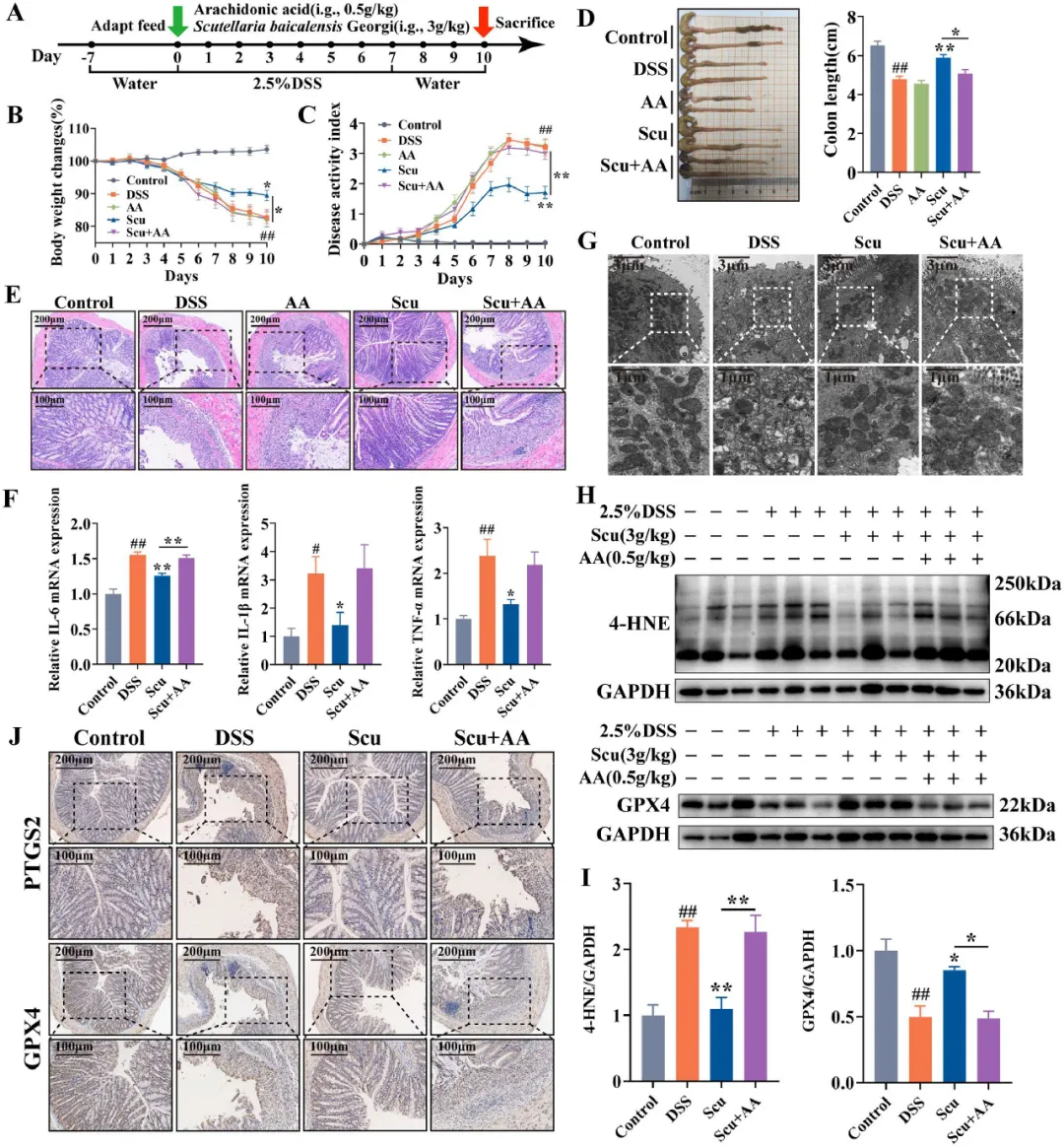 由于DSS组中观察到AA及其相关代谢物的增加,以及Scu对PUFA代谢的调节作用,当UC小鼠用Scu治疗时,也给予了AA补充。这项研究可以帮助研究者确认Scu的抗UC作用是否与UC小鼠的PUFA代谢和细胞铁死亡有关。补充AA后,Scu组小鼠线粒体形态破坏,GPX4表达降低,4-HNE结合蛋白和PTGS2水平升高。此外,研究者观察到更严重的肠道损伤和炎症,表明Scu组补充AA会加剧脂质过氧化和铁死亡,最终导致UC加重。