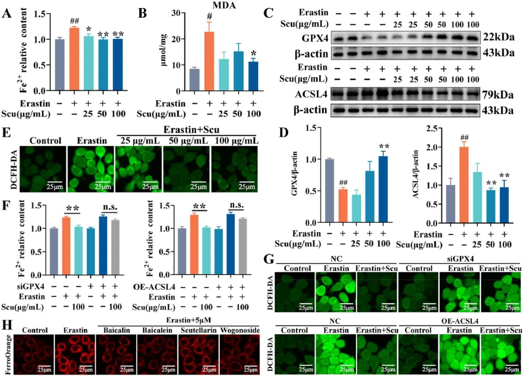 图9 Scu调节Erastin处理的HT-29细胞中GPX4/ACL4轴介导的铁死亡。Erastin(10μM)和不同浓度的药物在HT-29细胞中处理24小时。(A)Fe2+相对含量。(B)MDA水平。(C-D)免疫印迹检测GPX4和ACSL4的蛋白表达。(E)ROS的水平。HT-29细胞用siGPX4或ACSL4质粒转染24小时,然后用相应的药物再处理24小时。(F)Fe2+相对含量。(G)ROS的水平。(H)Scu提取物中主要成分的Fe2+荧光。结果以平均值±SEM表示。与对照组相比,#P<0.05和##P<0.01;与Erastin处理组相比,*P<0.05和**P<0.01;n.s.,无显著性。