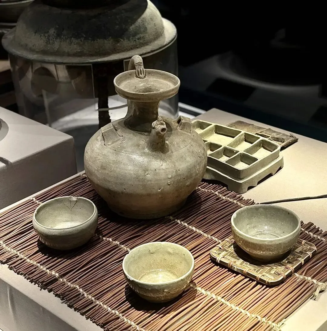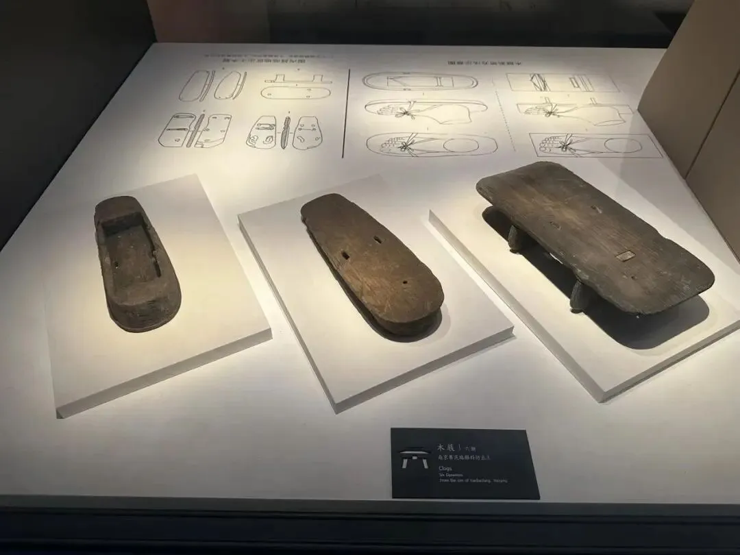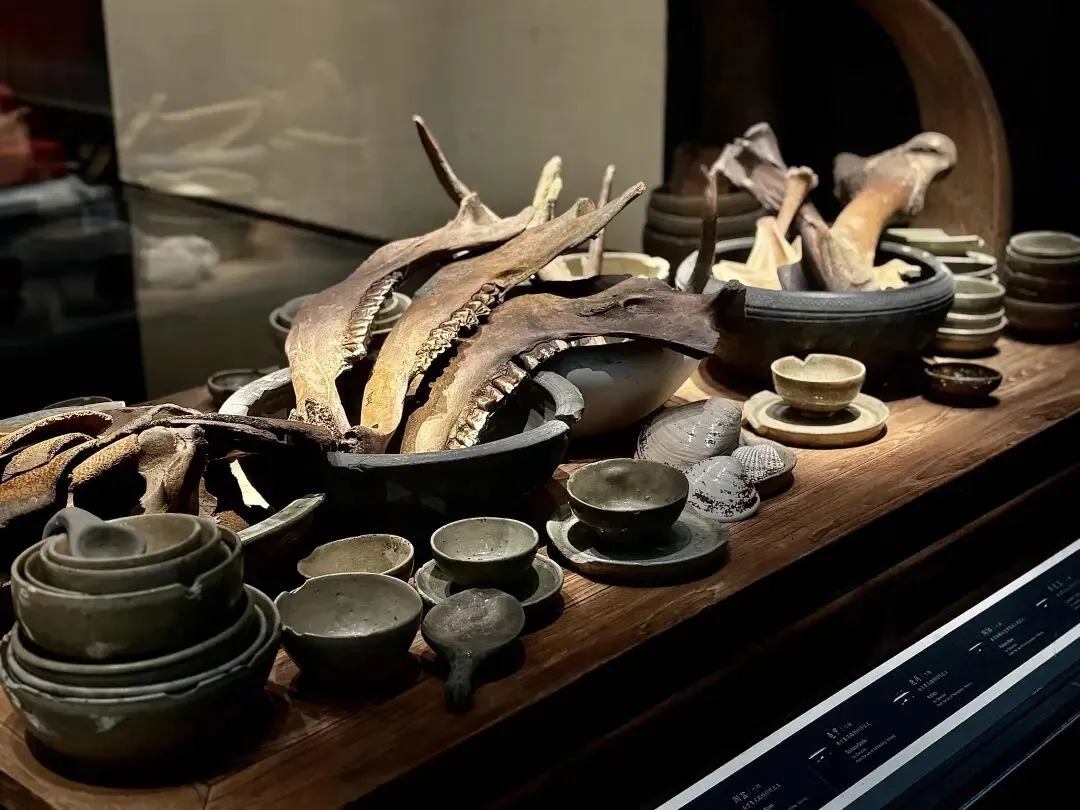 图3、4、5:六朝博物馆展出牛骨及鹿骨、鸡首壶及杯盏、木屐,南京颜料坊考古工地出土