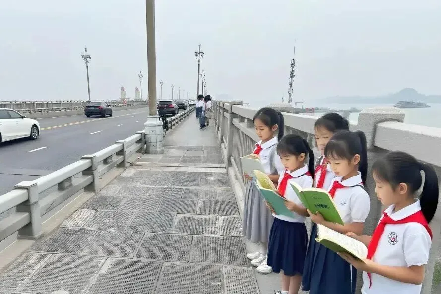 孩子们站在大桥上