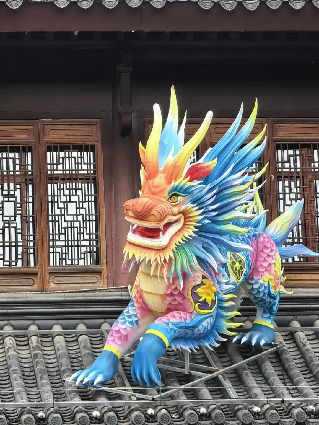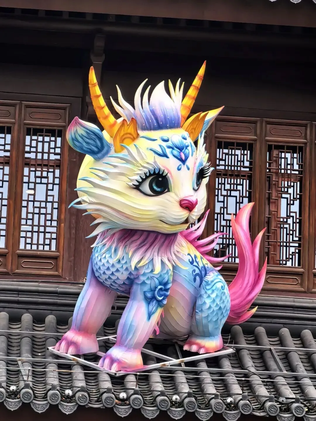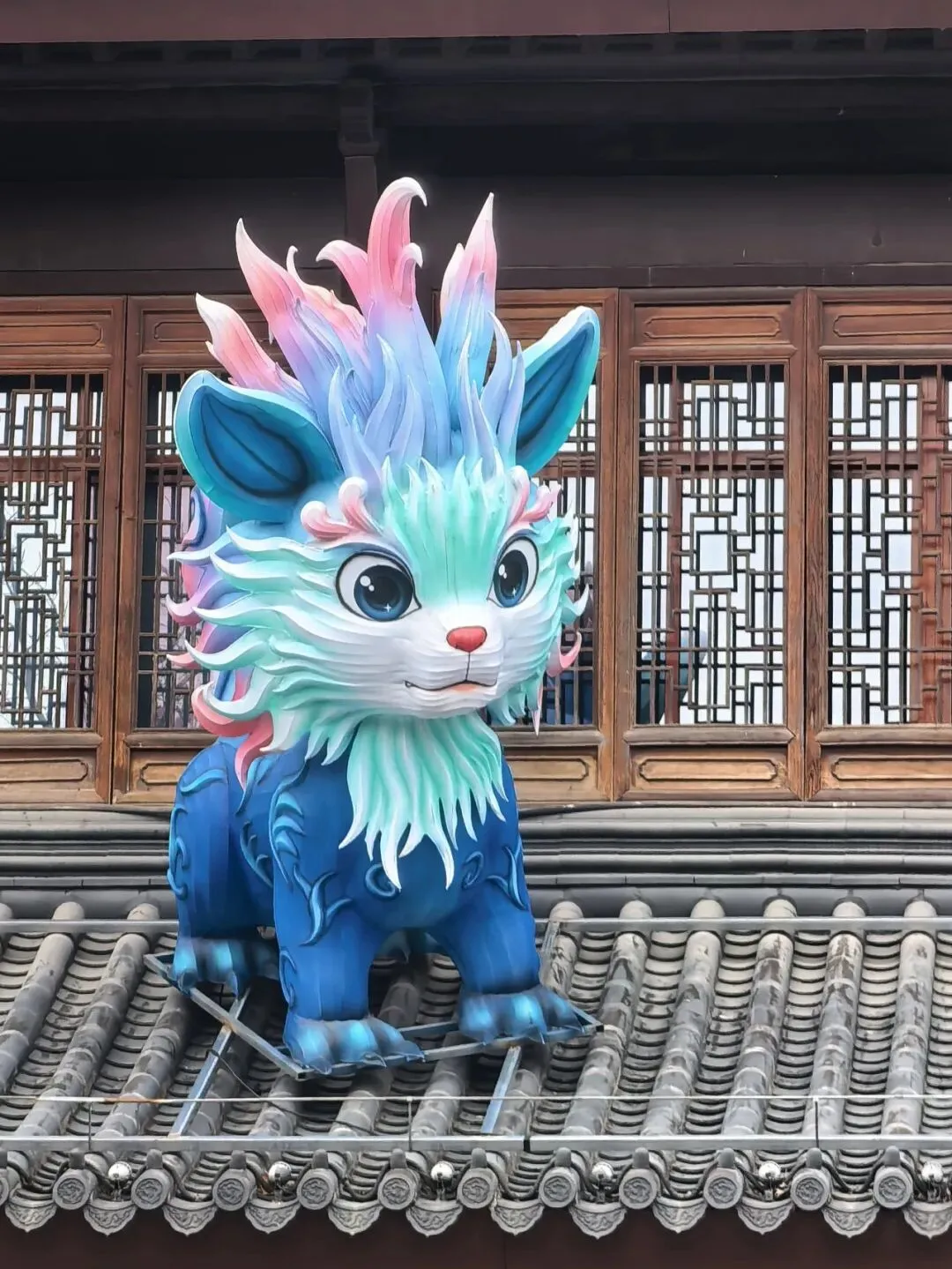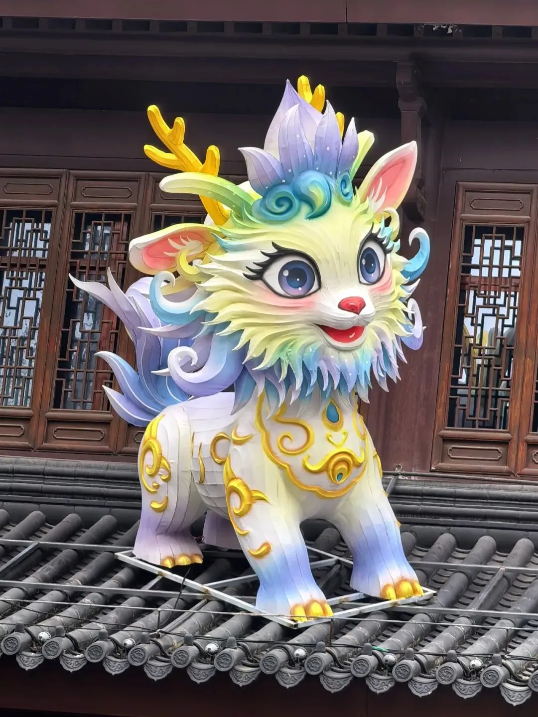 青瓦朱窗之上,四盏瑞兽彩灯次第排开,或灵动、或威严,将东方祥瑞与市井烟火,酿成了最鲜活的金陵春景。