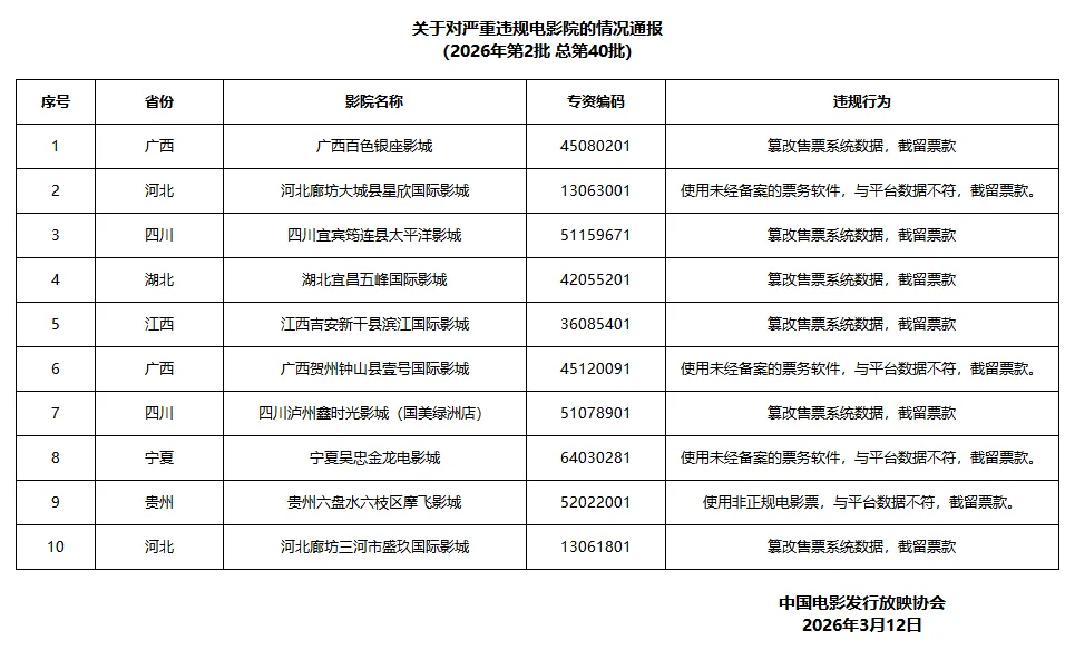 南京电影协会 | 关于对严重违规电影院的情况通报(2026年第2批 总第40批)