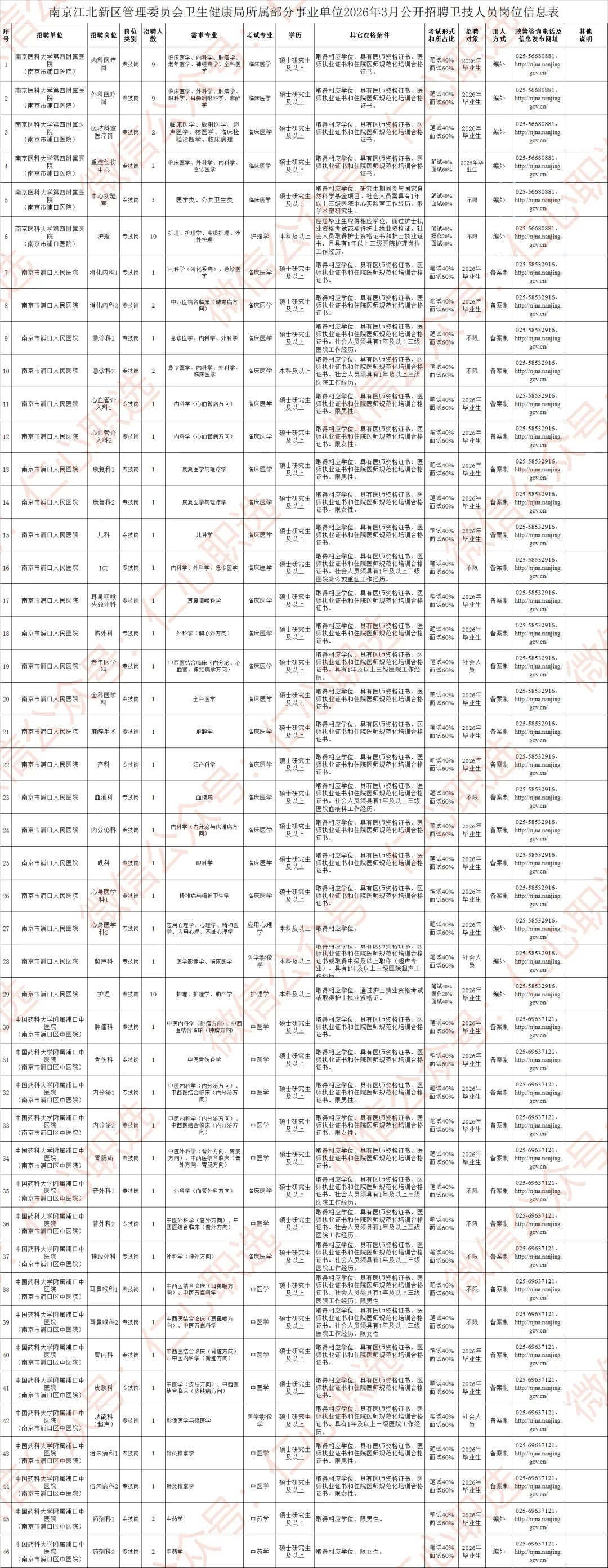 本次招聘相关信息在南京江北新区管理委员会网上发布。具体的招聘岗位、数量、资格条件等详见《南京江北新区管理委员会卫生健康局所属部分事业单位2026年3月公开招聘卫技人员岗位信息表》(以下简称《岗位信息表》)。
