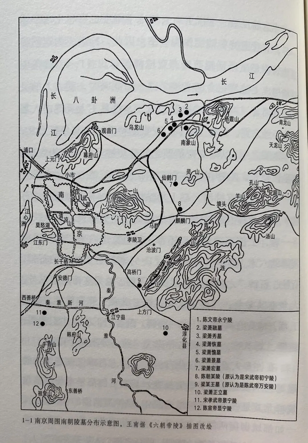 南朝各代陵墓均有留存,其中宋,陈帝陵居于建康周围,齐,梁帝陵则齐聚丹阳。因齐,梁两朝皆为萧何后裔,晋室南渡后居于武进县,即今江苏丹阳。此外,梁代诸王墓大多集中于建康周边,呈小规模聚集之态。