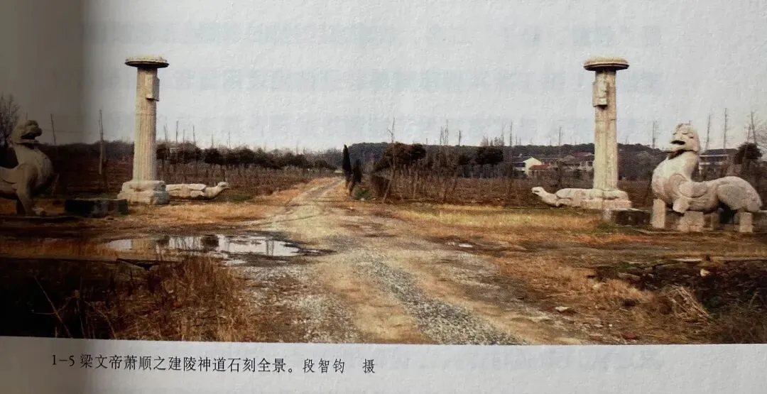 诸陵之中,以梁文帝的建陵神道保存最为完整。墓坐西朝东,沿神道由东向西依次为:石兽一对;方形石础一对,边缘有榫眼,础上部结构已失;石柱一对,两柱石额皆有完整题刻;石龟趺座各一对,上部石碑碑体已不存。神道宽十六米,各对石刻间隔约六米,整体气势不凡。