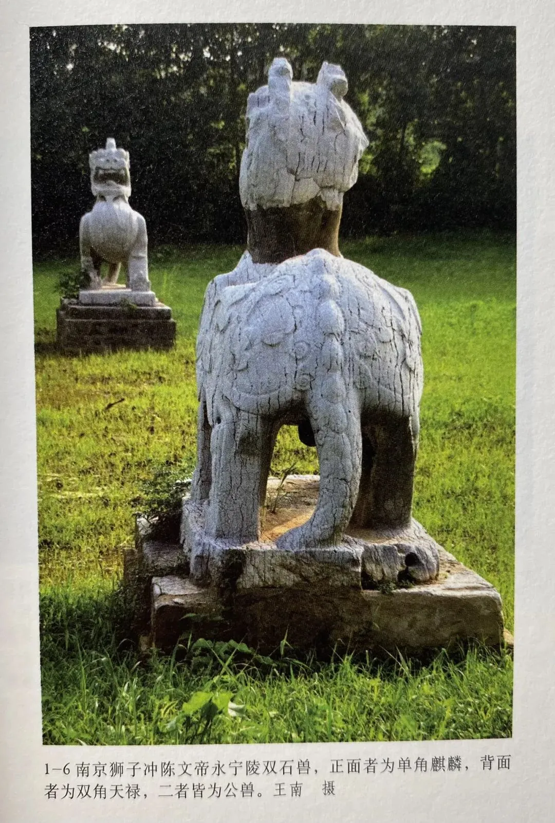 总体来看,南朝陵墓石兽可分为两大类:第一类专列于帝王陵前,成对出现,其中一只双角,一只独角;第二类则列于诸王墓前,头上无角,造型酷似狮子。