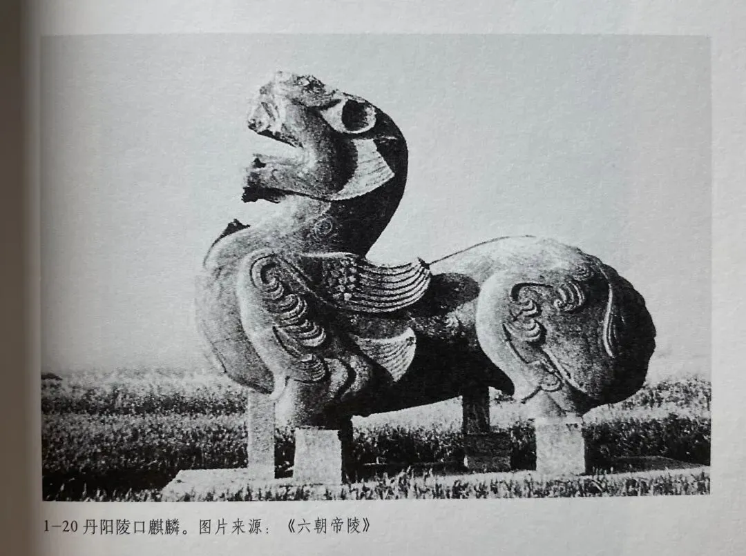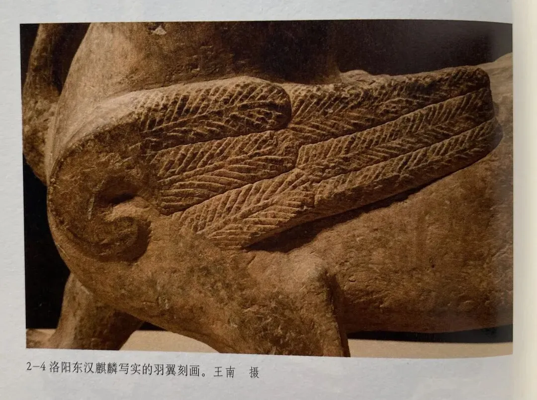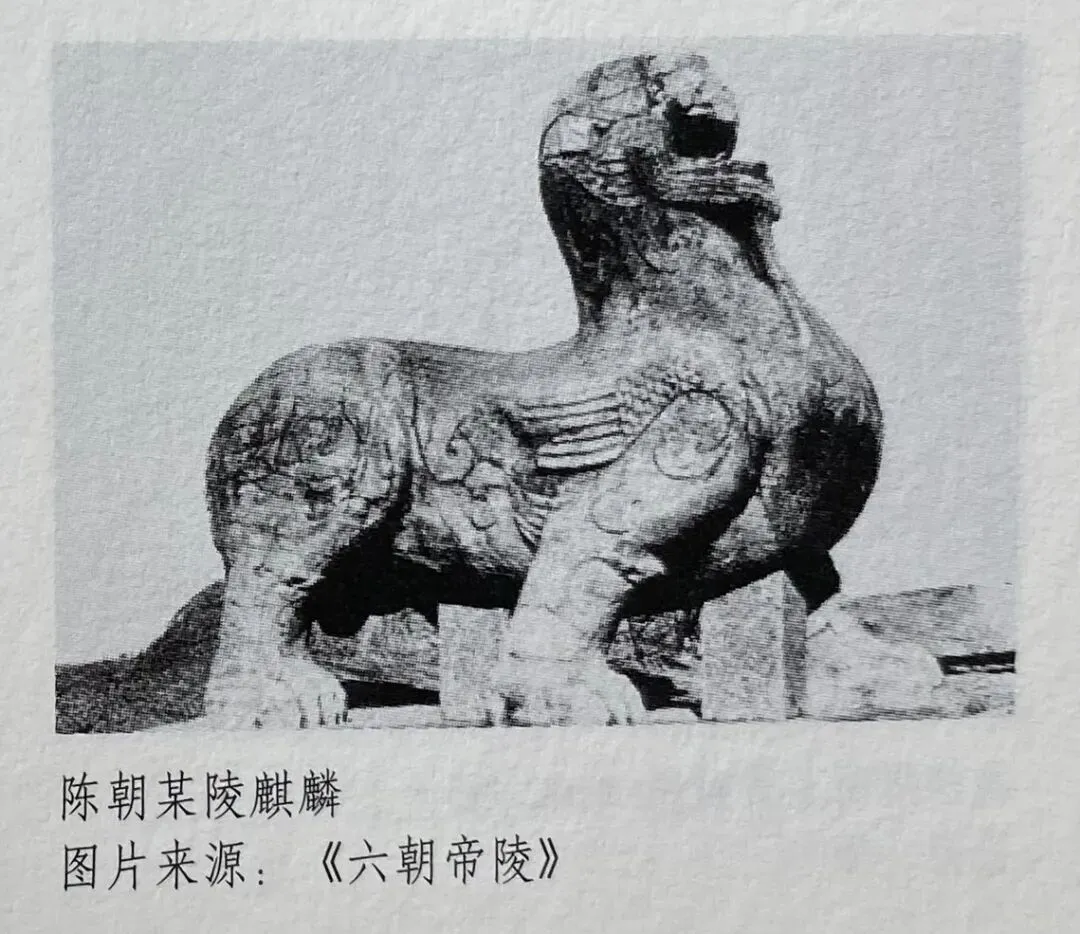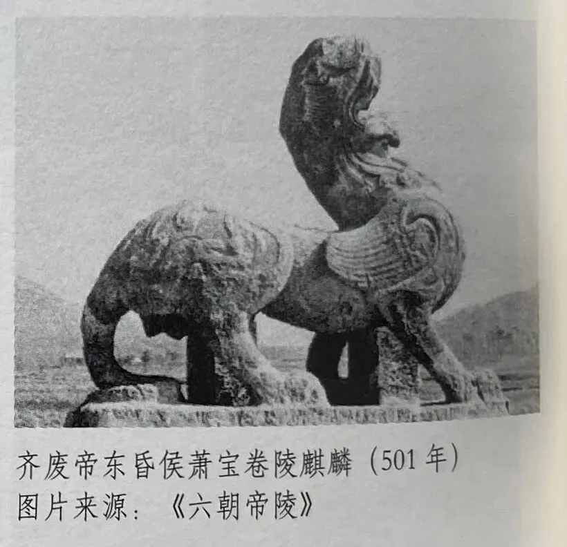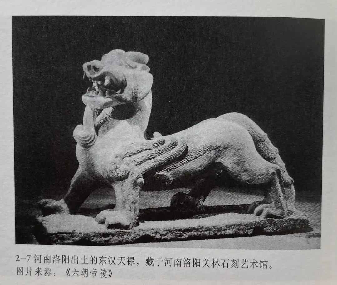 一些东汉普通墓葬之中倒是出现了南朝石兽的先祖。如洛阳出土的东汉单角麒麟。它的羽翼较为写实,接近西汉雁鱼灯中鸿雁羽翼的风格;而南朝石兽寓意的雕刻手法接近商周青铜器传统。