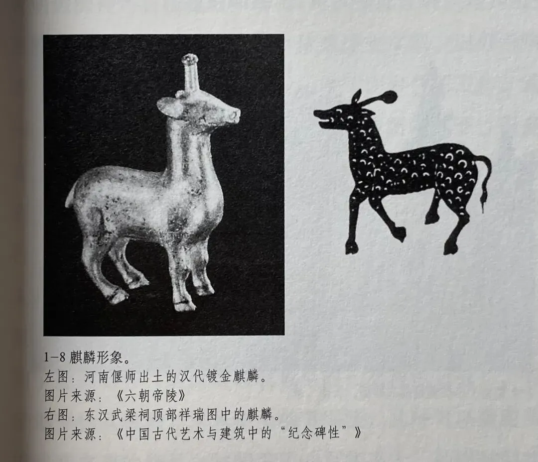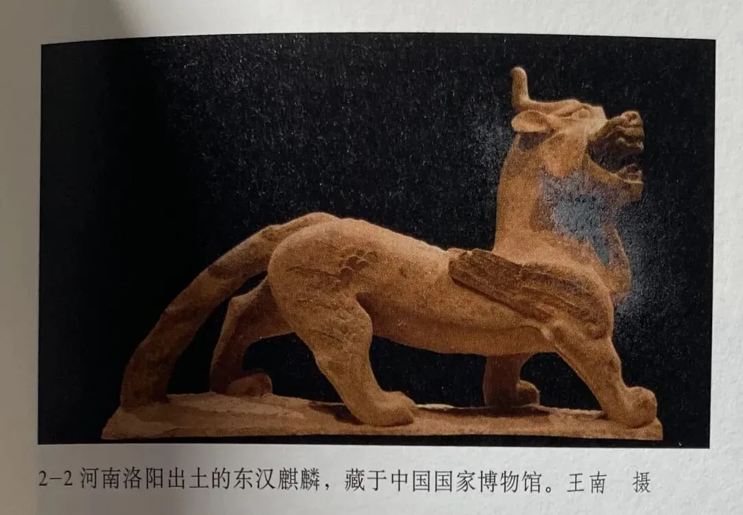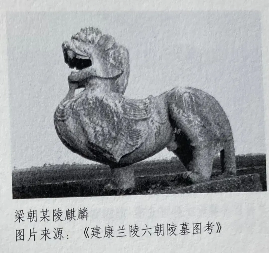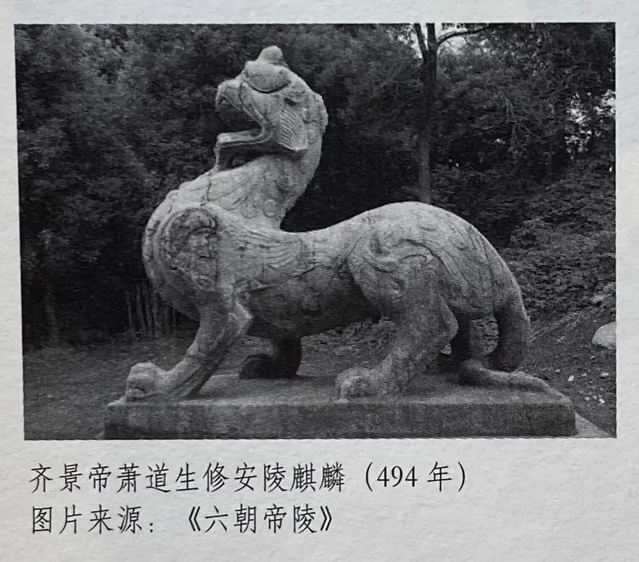一些东汉普通墓葬之中倒是出现了南朝石兽的先祖。如洛阳出土的东汉单角麒麟。它的羽翼较为写实,接近西汉雁鱼灯中鸿雁羽翼的风格;而南朝石兽寓意的雕刻手法接近商周青铜器传统。