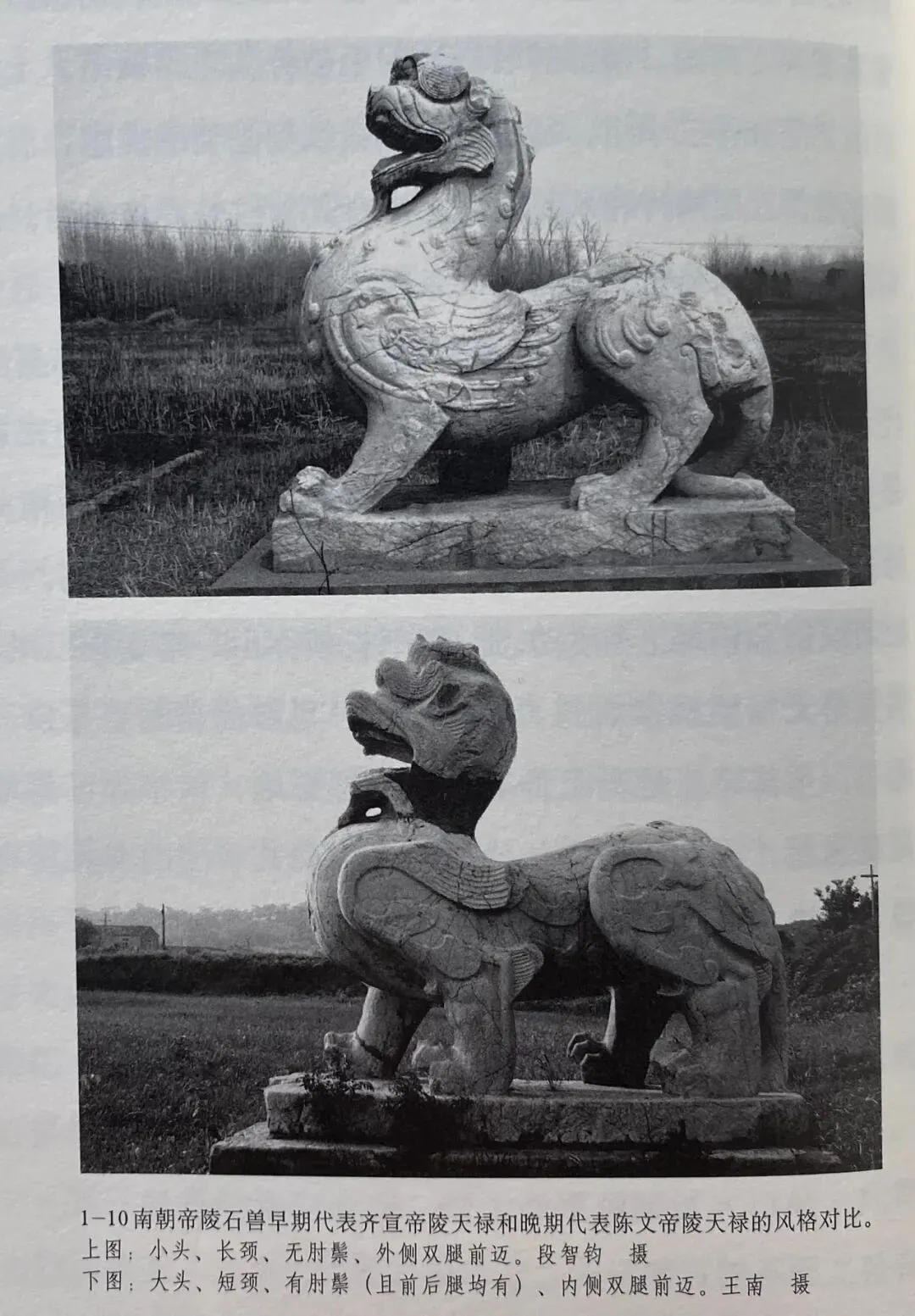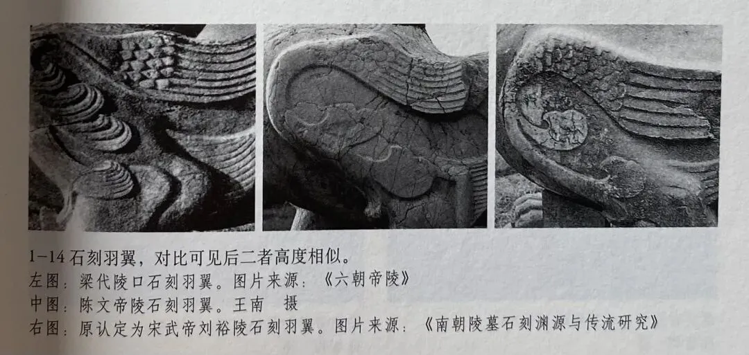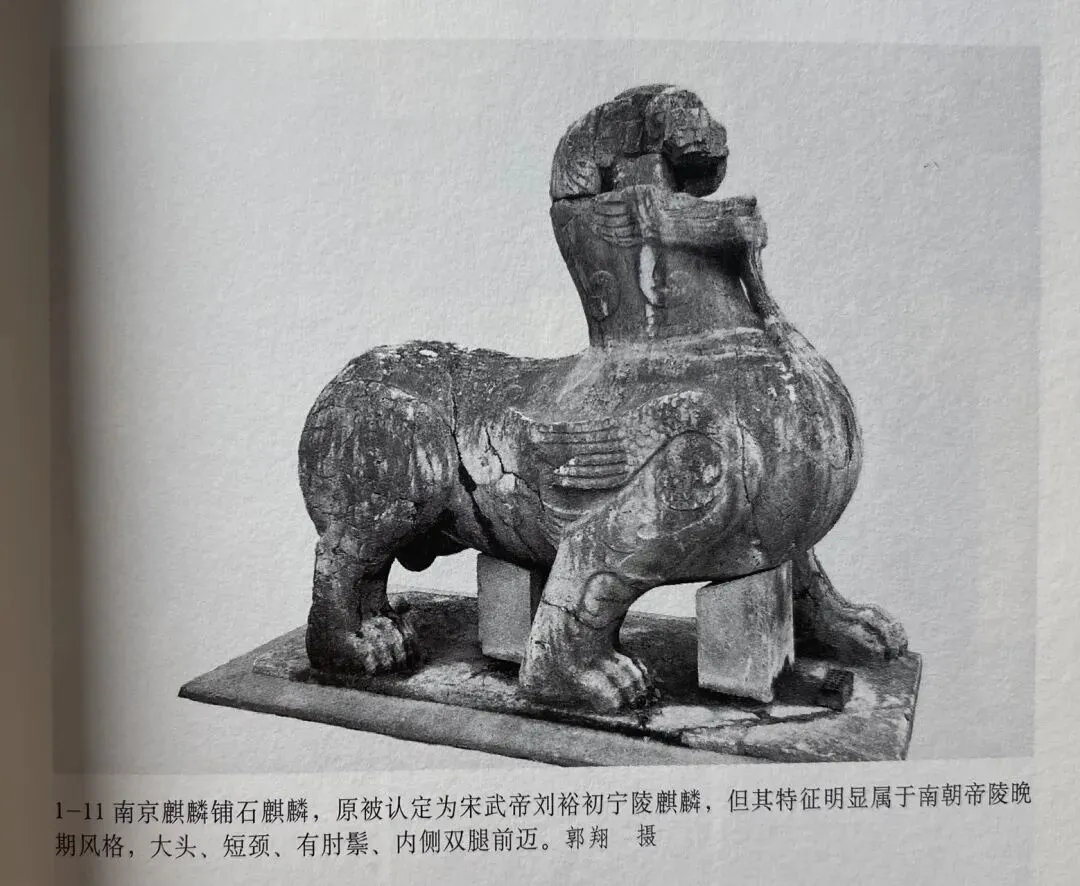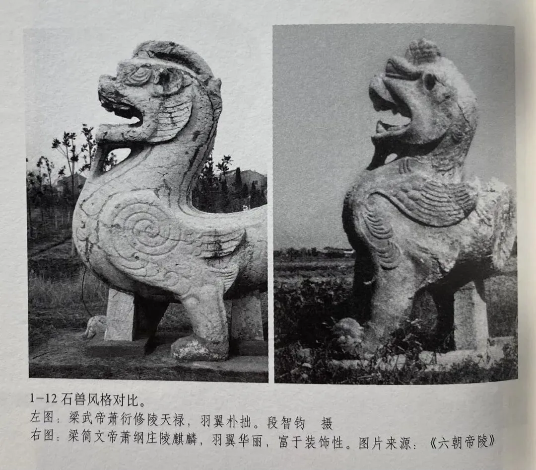 第一,面向陵墓望去,齐陵的左右二兽均是靠外侧的腿前迈,而梁陵正好相反,靠内侧的腿前迈,处于二者交界处的是梁文帝建陵石兽,不仅造型属于早期,而且也是梁陵中唯一外腿前迈的,属于齐陵的余音。而原来认为是宋武帝刘裕陵者则与梁陵一致,属于晚期作品。