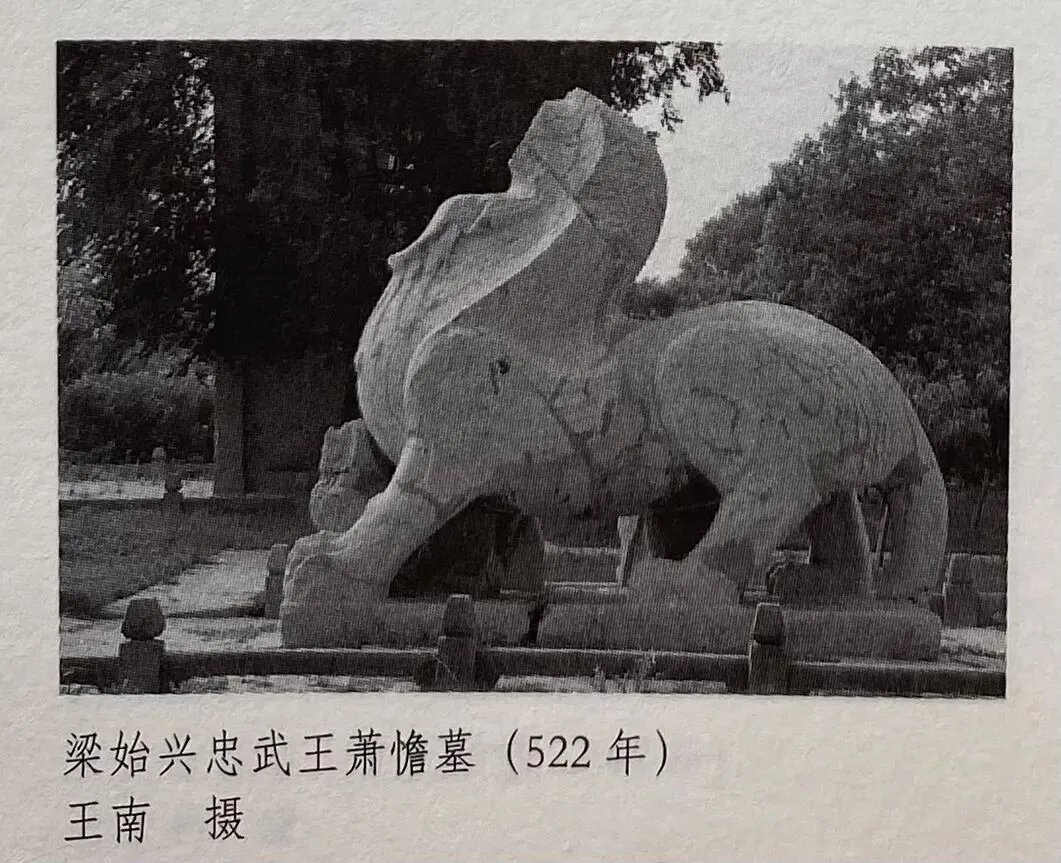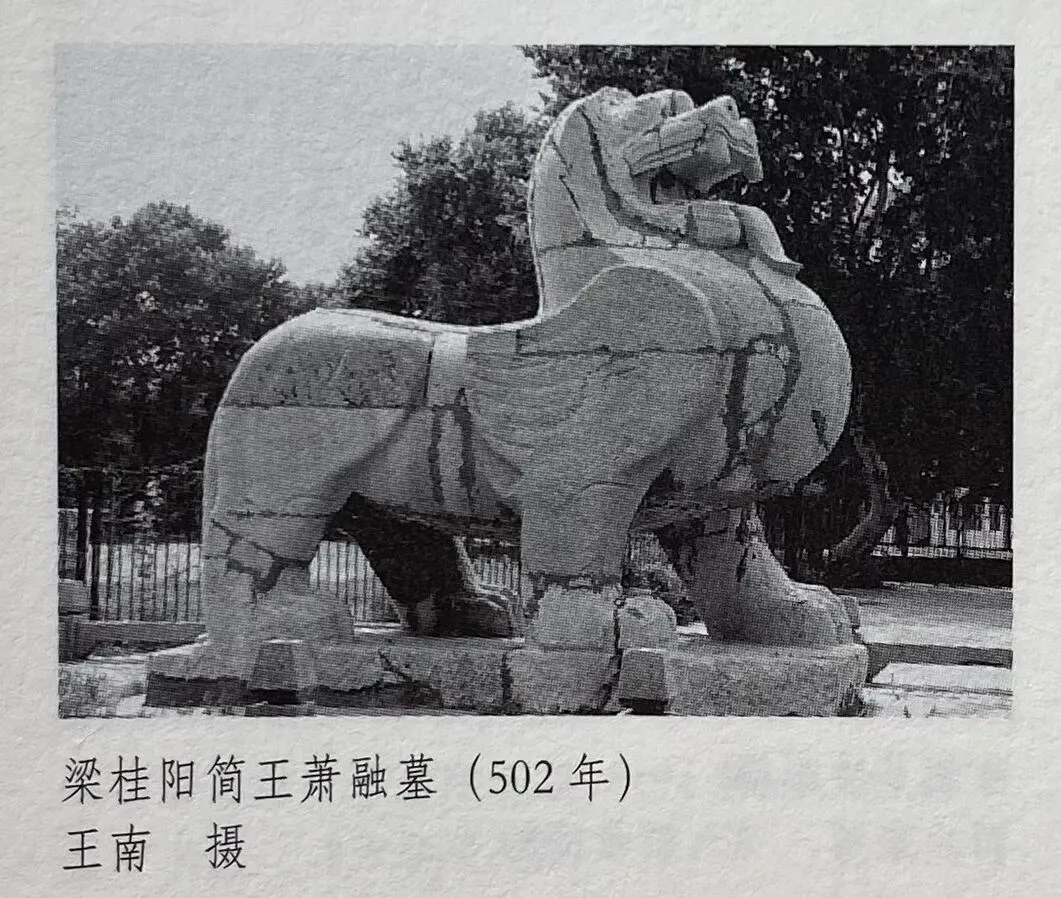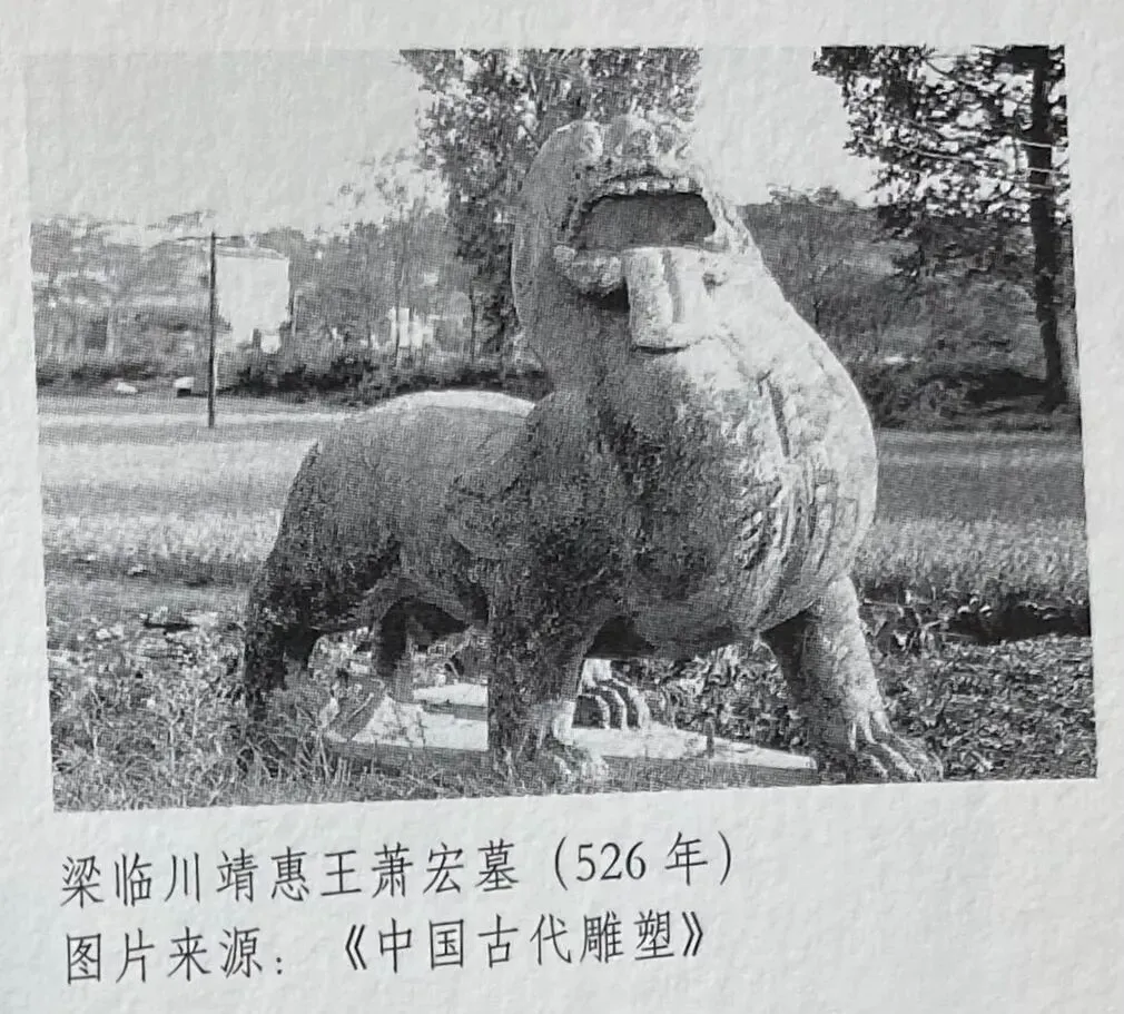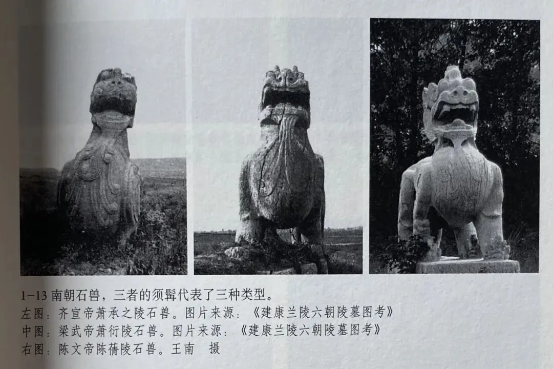 目前学界普遍认为无肘部鬃毛者大多为齐朝石刻,另有一处梁文帝陵石刻,属于齐梁交界时期。而有肘部鬃毛者则绝大部分是梁,陈时期的石刻。处于两大类石兽交替石刻的重要作品,是目前普遍认定的梁武帝萧衍陵石兽。这与梁武帝时期进行的一系列建筑方面的革新举措相一致,且梁武帝以崇佛著称于世,石兽中出现肘部鬃毛这一狮子特有的造型特征,恐怕与此不无关联。因为狮子是佛教中的重要护法神兽。