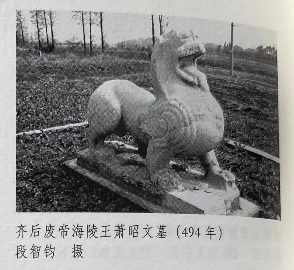 其三为丹阳陵口石兽,位于齐梁帝陵区入口处,此对石兽身形最为巨大雕饰最华美。