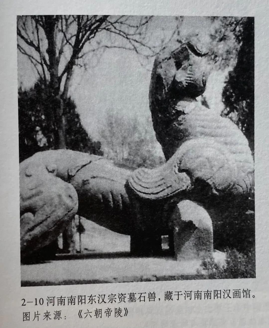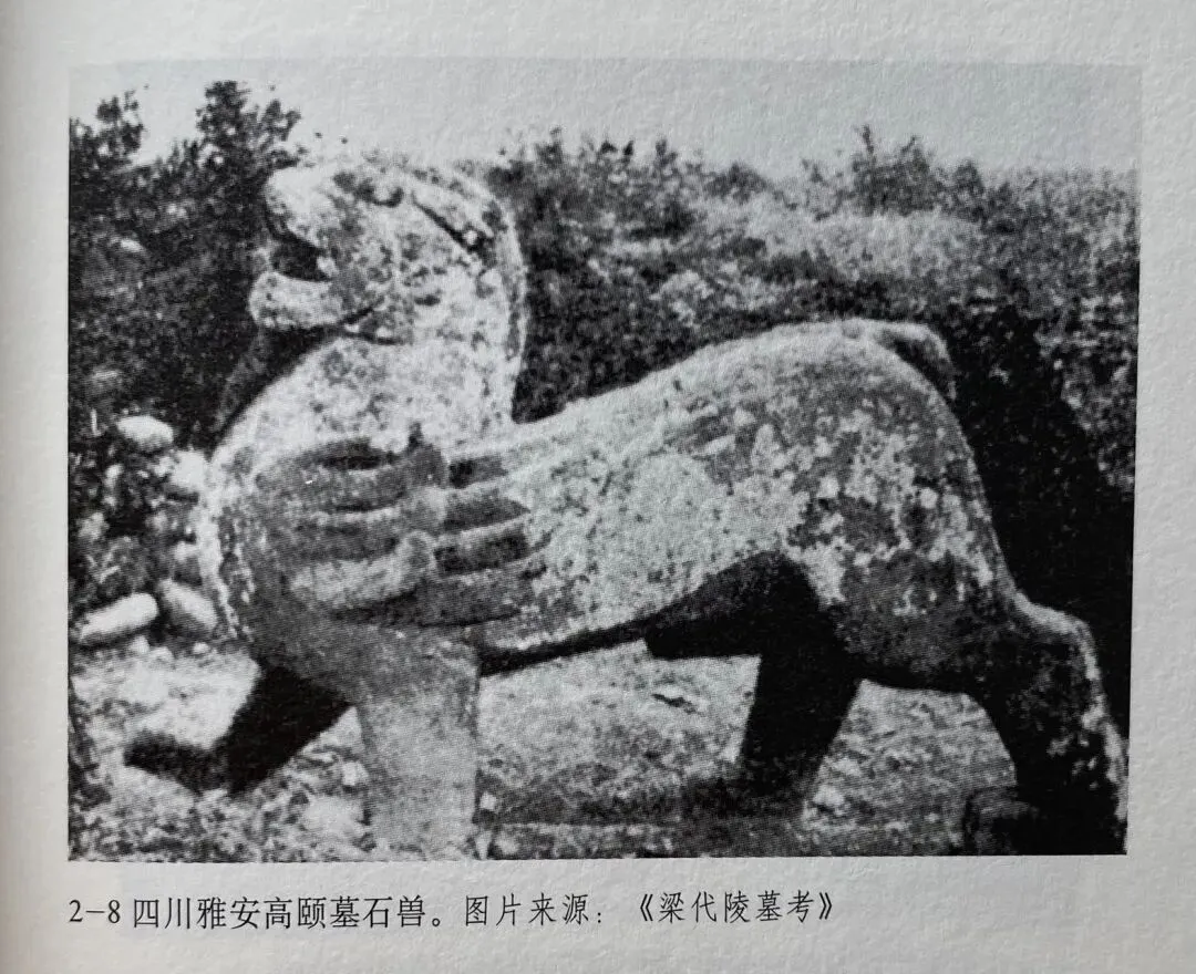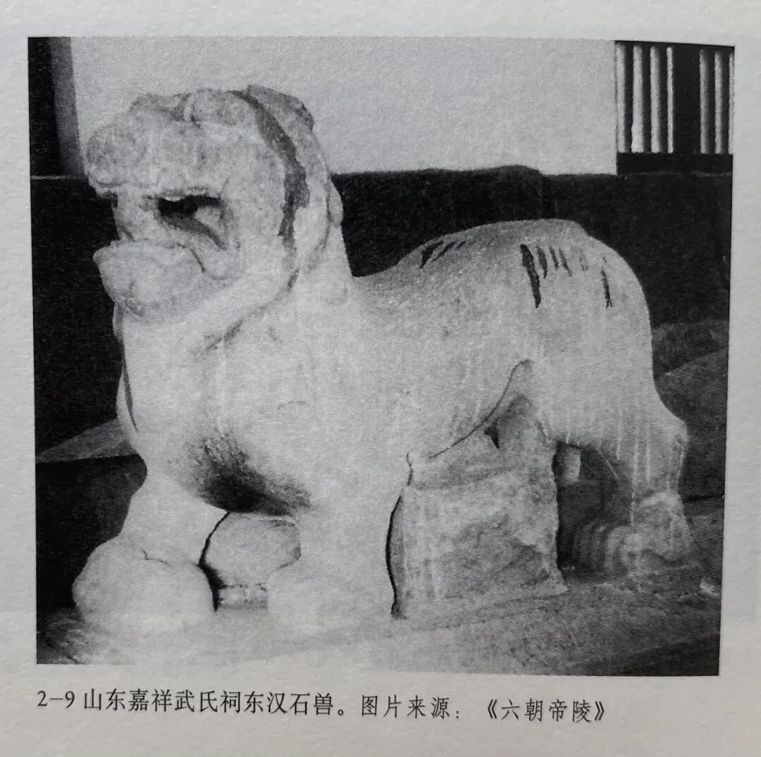 南朝石兽的另一个祖先是东汉末年四川雅安高颐墓前的一对石兽。此外还有年代更加久远的山东嘉祥武氏祠东侧石兽,而河南南阳东汉宗资墓的石兽,已经十分接近南朝早期石兽。