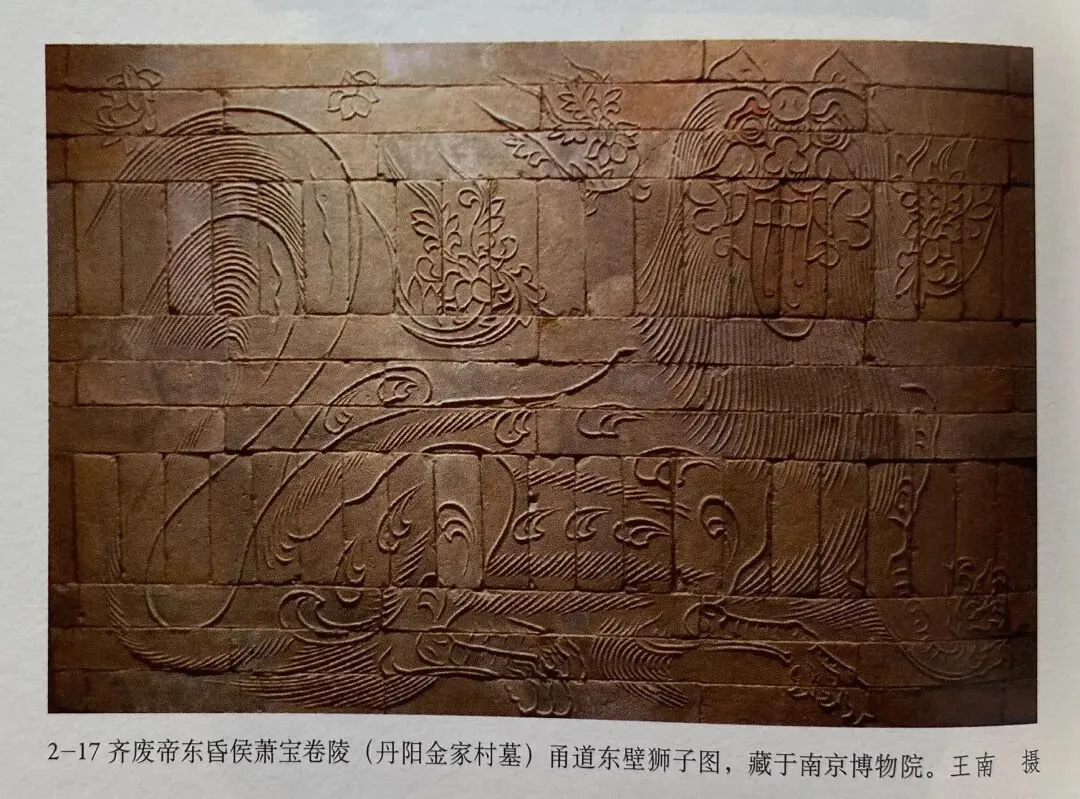 此外,在绘画中也能看到南朝石兽继承等中国艺术传统。如河南邓州出土的南朝画像砖中四神形象,青龙酷似天禄、麒麟;同时期的齐东昏侯墓室甬道中的壁画《狮子》等。