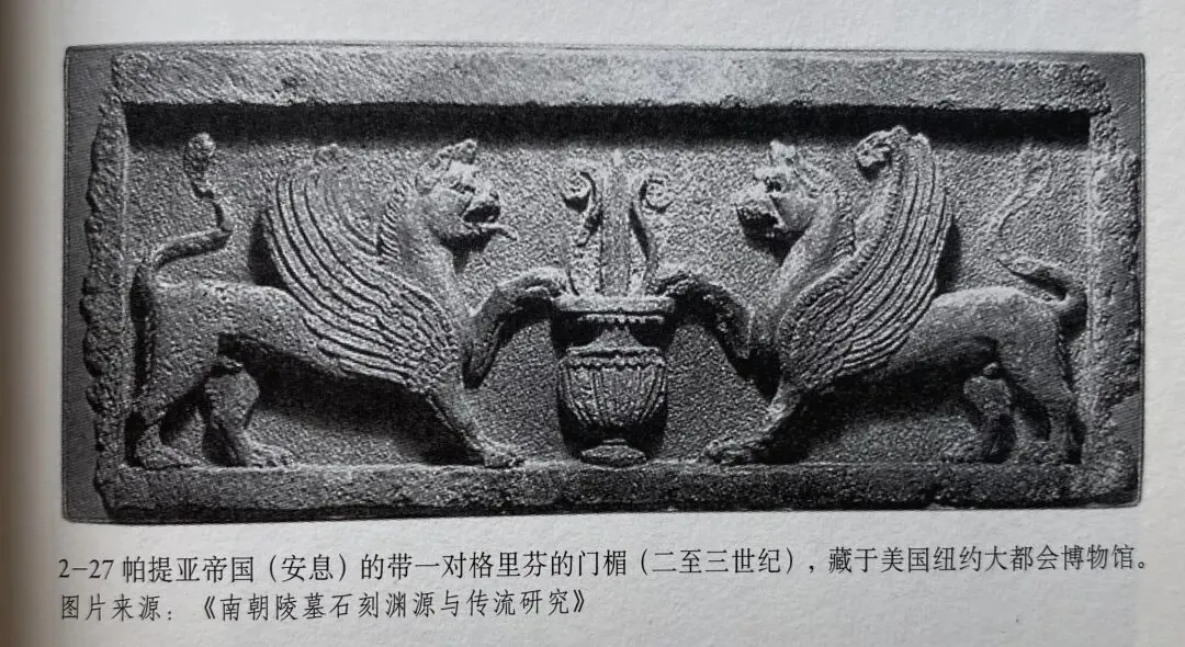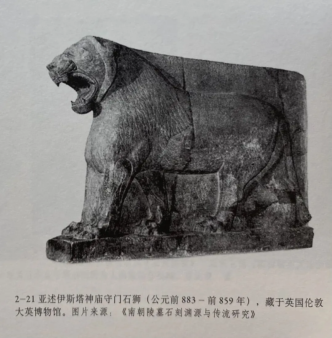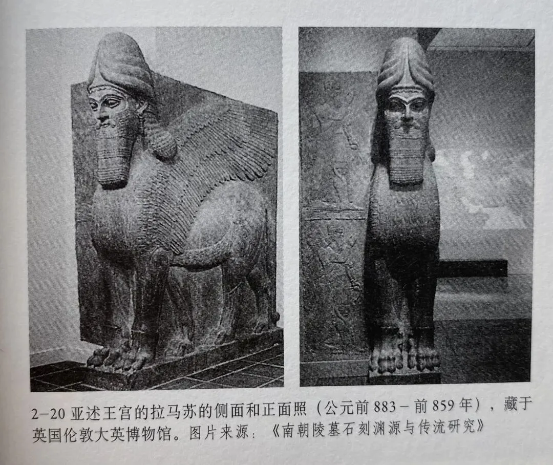 南朝石兽最明显的祖先是古代波斯的带翼石狮。狮子作为守门神兽,早在两河流域和古埃及的远古建筑中就已经盛行。带翼兽最早出现在埃及,后来传到叙利亚的腓尼基人和赫梯人那里,再传入亚述,形成了拉马苏雕刻。亚述带翼兽除了受到埃及的影响,还来源于苏美尔人的艺术。典型者如藏于大英博物馆的神兽守门石狮。公元前五世纪的波斯波利斯王宫遗址中,一组浮雕格里芬呈现为双角带翼石狮,是中国翼狮的重要原型。