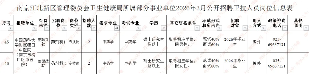 为更好选拔优秀人才,充实事业单位人才队伍,优化人才结构,根据《江苏省事业单位公开招聘人员办法》(苏办发〔2020〕9号)精神,南京江北新区管理委员会卫生健康局所属部分事业单位面向社会公开招聘88名(备案制37名,编外51名)卫技人员。现将有关事项公告如下:本次招聘相关信息在南京江北新区管理委员会网上发布。具体的招聘岗位、数量、资格条件等详见《南京江北新区管理委员会卫生健康局所属部分事业单位2026年3月公开招聘卫技人员岗位信息表》(以下简称《岗位信息表》)。1.具有中华人民共和国国籍,遵守中华人民共和国宪法和法律,拥护中国共产党领导和社会主义制度;3.具备适应岗位要求的身体条件,年龄在38周岁以下(1987年3月12日后出生),对年龄有特殊要求的,以岗位信息表中注明的为准,年龄计算方法不变;有工作经历要求的,工作经历计算的截止日期为2026年3月12日;4.具备报考岗位要求的其他资格条件,详见《岗位信息表》;5.取得祖国大陆全日制普通高校学历的台湾学生和取得祖国大陆承认学历的其他台湾居民应聘时按国家和我省有关规定执行。2.尚未解除纪律处分或者正在接受纪律审查的人员、刑事处罚期限未满或者涉嫌违法犯罪正在接受调查的人员;3.与事业单位工作人员有夫妻关系、直系血亲关系、三代以内旁系血亲关系或者近姻亲关系等亲属关系的,不得应聘该事业单位的组织(人事)、纪检监察、审计财务岗位;与现有在岗人员存在上述关系的,不得应聘到岗后形成直接上下级领导关系的管理类岗位,以及《事业单位人事管理回避规定》明确应当回避的岗位;4.根据 2020 年3月13日颁布施行的《江苏省事业单位公开招聘人员办法》招聘,被聘用到江苏省地方各类事业单位,且在2026年9月19日前未满3年服务期的在编(在册)人员;5.其他有规定(含协议明确)不得解聘离开现工作单位(岗位)的人员,以及国家和江苏省另有规定不得应聘到事业单位或有关岗位的人员。1.招聘条件中的“2026年毕业生”,指在2026年毕业并取得学历(学位)证书,且报名时无工作单位的人员。其中,能够提供《毕业生就业推荐表》(原件)的普通高校毕业生,取得学历(学位)证书、住院医师规范化培训合格证书及医师资格证书的日期可放宽至2026年8月31日;国(境)外同期毕业人员,取得学历(学位)证书的日期可适当放宽,但须在2026年8月31日前完成教育部留学服务中心学历认证。2024年和2025年普通高校毕业生,以及国(境)外同期毕业且已完成学历认证的人员,如报名时无工作单位,可应聘面向2026年毕业生岗位。聘用后有关事项按国家规定办理。“三支一扶”计划等基层服务项目的志愿者,如参加服务项目前无工作经历,服务期满且考核合格后2年内的,可应聘面向2026年毕业生岗位。以普通高校应届毕业生应征入伍服义务兵的人员,退役后1年内的,可应聘面向2026年毕业生岗位。面向社会招收的普通高校应届毕业生培训对象,住院医师规范化培训合格当年在医疗卫生机构就业的,在招聘中按当年应届毕业生同等对待。2.对经住培合格的本科学历临床医师,在招聘中与临床医学、口腔医学、中医专业学位硕士研究生同等对待(其中住培合格证书中的培训专业原则上应当与招聘岗位的专业或类别要求相一致)。3.资格条件中“专业”的设置参考目录为《江苏省2026年度考试录用公务员专业参考目录》,另包括部分未列入专业参考目录但确有高等学校开设且有事业单位需要的专业。1.报名、照片上传时间:2026年3月12日9:00至3月19日16:00。逾期不再接受报名。2.报名方式:本次招聘采取网上报名方式,报名人员登录易报名(链接:https://www.ecloudexam.com/website/ecloudform/260302114019),进行报名。须使用有效期内的第二代居民身份证进行注册账号并完善报名内容。报名人员应对所填写的内容负责,凡弄虚作假者,一经查实,即取消考试、聘用资格。3.资格初审:招聘单位根据其设置的招聘岗位条件,负责对网上报名的应聘人员进行报考资格初审。资格初审时间:2026年3月12日9:00至3月20日9:00。应聘人员可在报名网站上查询是否通过招聘单位的资格初审。网上资格初审不通过的,可在报名截止前补充修改相关信息或改报其他符合条件的岗位。资格初审通过后,考生不得更改报名信息,不得改报其他岗位。4.应聘人员对资格初审异议的陈述申辩时间:2026年3月12日至3月19日期间的9:00-11:30,14:00-17:00;2026年3月20日9:00-11:00。5.资格初审单位对资格初审异议的处理时间:2026年3月12日至3月19日期间的9:00-11:30,14:00-17:00;2026年3月20日9:00-16:00。应聘人员网上提交报名信息后可到报名网站查询是否通过资格初审。如对初审意见有异议,请及时向招聘单位或其主管部门陈述申辩,联系方式详见《岗位信息表》中相应岗位的“政策咨询电话”。通过资格初审的应聘人员,在报名网站缴纳报名费(100元/人)(苏价费函﹝2007﹞146号)。缴费确认时间:2026年3月12日9:00至3月22日17:00。通过资格初审并且完成缴费确认的人员,即视为报名成功。缴费成功后,除应聘岗位被取消外,不退还报名费。未按时在网上确认报名资格、上传照片、缴纳报名费的视为报名无效,逾期不再提供报名服务。各岗位笔试开考比例为1:3,达不到开考比例的岗位将相应核减或取消招聘计划,并在南京江北新区管理委员会网站公布。报名结束后,报考被取消岗位且已成功缴费的应聘人