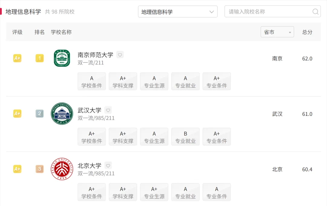 在 2025 年公布的软科中国大学专业排名里,南京师范大学凭借硬核实力,一举拿下地理信息科学、能源服务工程两个全国第一,师范与文理特色领域王牌专业强势领跑。尤其是地理信息科学,南京师范大学在软科中国大学专业排名中以62.0 的总分稳居全国第一,学科支撑、专业条件两大核心指标均获评 A+,彰显了南师大的地理信息科学专业已然站在了全国最顶尖的位置,实力遥遥领先。南京师范大学的整体实力