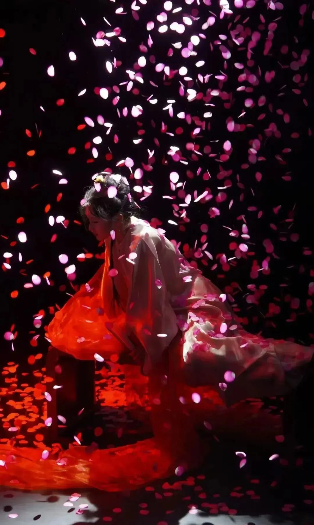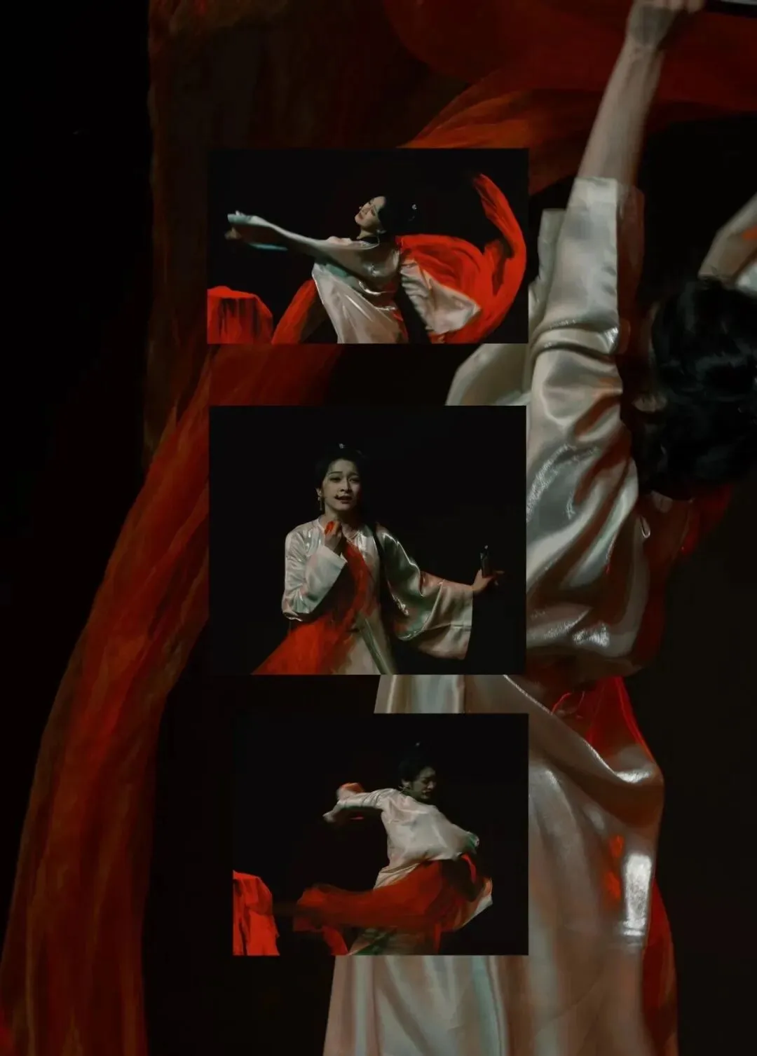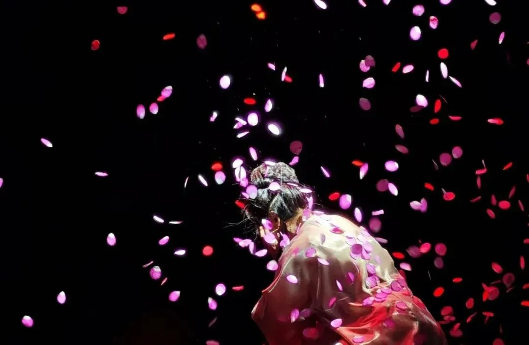 全剧最震撼的视觉段落,是李香君毁容后,代表鲜血的红色绸缎缓缓落下,随即化作点点桃花。