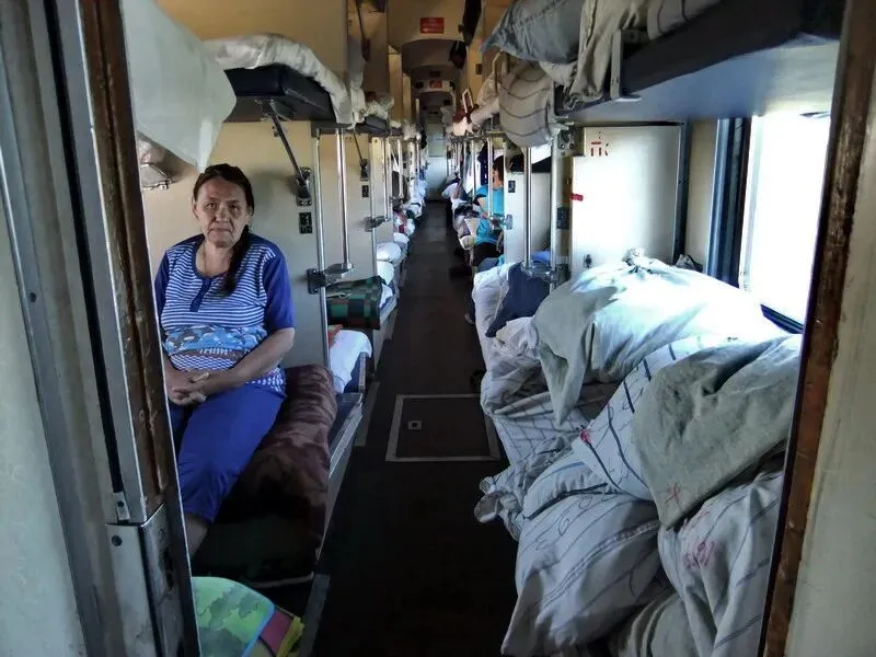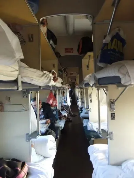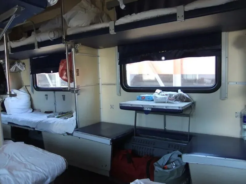 这是跟中国不同的边铺,上下铺,下铺可以搞成桌椅状态。我坐的是边铺,第一次我就无师自通地把卧铺变为桌椅。以前看网友写过俄罗斯的卧铺车厢,但没看过照片。因为是深夜,车厢里很暗,我进去后的第一感觉就是懵,以为是走进了仓库。想到列车员在车厢下,非常仔细地检查、核对我的车票和护照,我不可能上错车,于是往里走找铺位。这是我白天拍的硬卧车厢,一进门右边的上、下卧铺上,堆着用过的或还没开封过的干净的被套、铺单等。如果是在黑夜里,有些人的被子耷拉出铺位,有些人的大脚丫超出卧铺的长度,影影绰绰,真的是像乱糟糟的仓库。