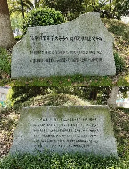 土坡上有树,碑被挡住,在下面并不容易发现。绕过去,走上几级台阶,仙鹤门遇难同胞纪念碑就在眼前了。碑名、碑文分两块石头左右而立,碑后就是隆起的“大坟”。碑文上清楚地介绍:1937年12月13日,侵华日军攻占南京东郊马群、仙鹤门一带,俘获我抗战官兵及民众15000余人。同年12月18日,日军分散多处将4000多名手无寸铁的平民和俘获集体屠杀。翌年春,仙鹤村附近尚有大批尸体横躺在村外麦地里。据当地居民谭庆瑞、和允兴、仇兴中、和允州、盛文金等共同回忆,1938年春,村民们曾自发将遇难同胞的尸骨,分别就近掩埋于一座“大坟”内。此座“大坟”内掩埋尸体约七百具。