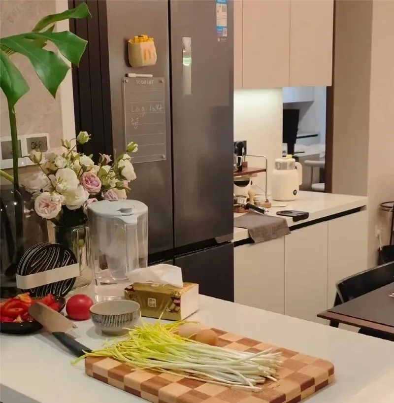 3 他们厨房用的家电,全是小型化的,没有那种硕大的吸油烟机,就是贴墙的那种侧吸款,几乎不占空间,冰箱也选了180升的小尺寸,只放刚需食材,这样不会堆很多用不完的冷冻食品,反正小户型根本没地儿放大冰箱,放了也只会让厨房挤得转不过身来。