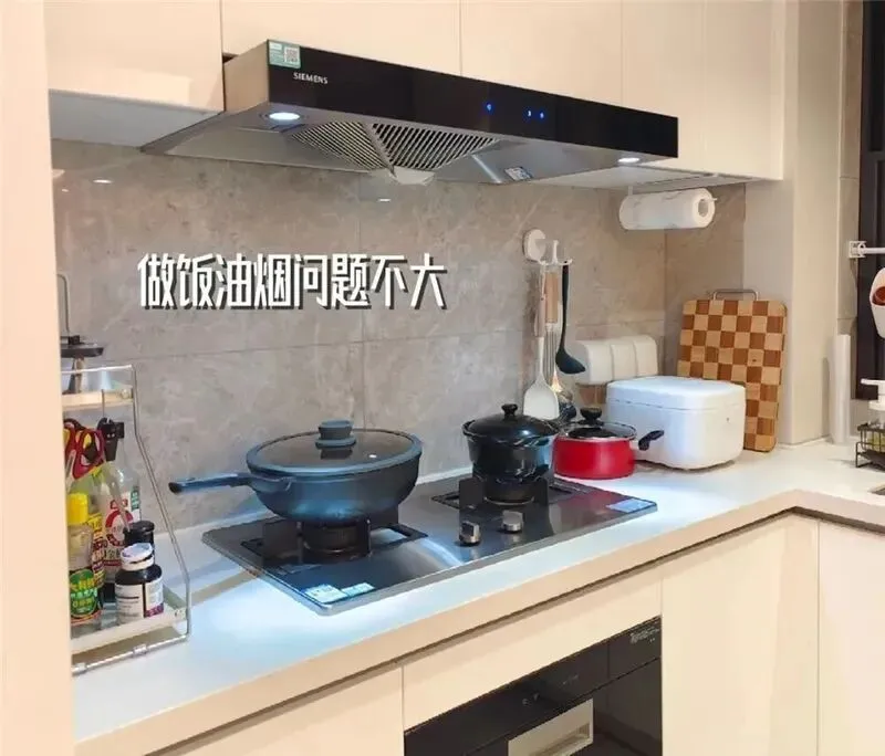 不过有时候做大菜,比如红烧肉或者油比较大的菜,油烟会溢到客厅,但他们说平时做饭不重油,所以影响不大,其实,就算有点油味,也比以前憋闷好多。