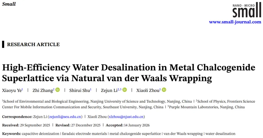 本研究成功演示了一种名为“范德华包裹”的新型电极设计策略,并将其应用于高效电容去离子脱盐。通过合成 (SnS)₁.₁₅TaS₂ 超晶格,实现了SnS活性层与金属性1H-TaS₂层的周期性交替堆叠,形成了一种本征的包裹结构。这种结构不仅利用导电TaS₂层增强了材料的整体导电性,为SnS层提供了高效的电子传输网络,还通过其独特的交替包裹构型,有效缓冲了充放电过程中的体积变化应力,从而显著提升了电极的结构稳定性和循环寿命。得益于这些协同优势,(SnS)₁.₁₅TaS₂ 超晶格电极展现了卓越的脱盐性能(容量59.6 mg g⁻¹,速率8.7 mg g⁻¹ min⁻¹)和出色的循环稳定性。这些发现表明,范德华包裹策略是构建用于实际电化学应用(尤其是高效水脱盐)的高性能复合电极的一种极具前景的方法。