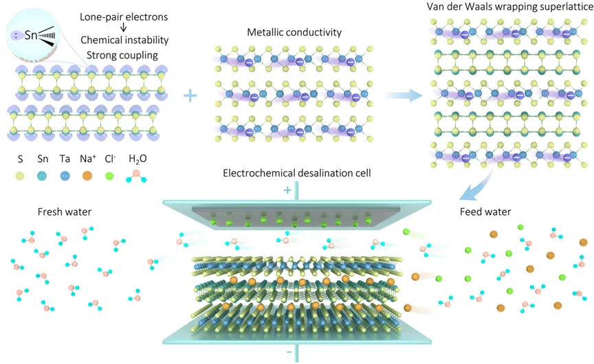 图1 高性能电化学脱盐用SnS1.15TaS2超晶格的范德华包裹策略示意图。