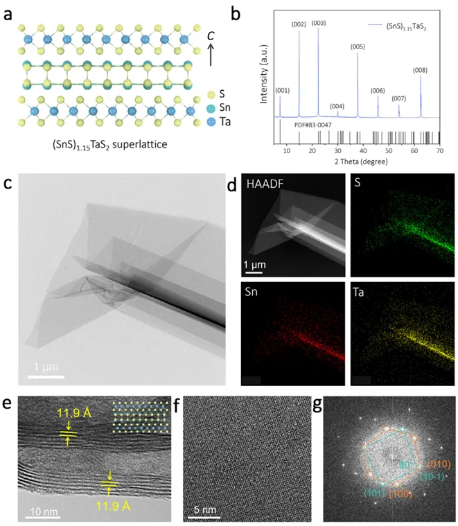 图2 (a) (SnS)1.15TaS2超晶格的示意图。(b) (SnS)1.15TaS2单晶的 XRD 图。(c) 脱层的(SnS)1.15TaS2纳米片的TEM图像。(d) (SnS)1.15TaS2纳米片的 HAADF -STEM图像和元素映射图像。(e) (SnS)1.15TaS2纳米片的横截面 HRTEM 图像。(f) (SnS)1.15TaS2纳米片基面的 HRTEM 图像。(g) (f)的FFT 图。可以识别出两组衍射斑点,分别对应于1H-TaS2的匹配(010)面和SnS子层的(10$∖bar 1$)面。