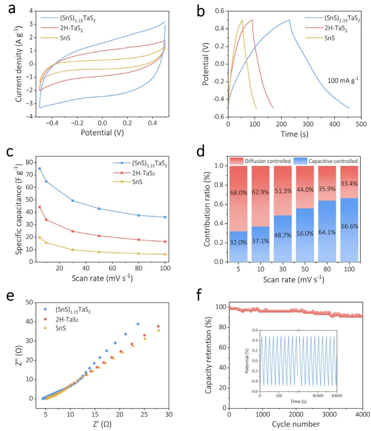图3 (SnS)1.15TaS2、TaS2和SnS电极在1 m氯化钠溶液中的电化学性能。(a) 扫描速率为100 mV s−1时的CV曲线。(b) 电流密度为100 mA g−1时的 GCD 曲线。(c) 扫描速率为5、10、30、50、80和100 mV s−1时的比电容。(d) 不同扫描速率下(SnS)1.15TaS2的归一化贡献比。(e) 各电极的奈奎斯特图。(f) (SnS)1.15TaS2在电流密度为2 A g−1时的循环稳定性(4000次循环)(插图:(SnS)1.15TaS2电极在长循环期间的部分 GCD 曲线。