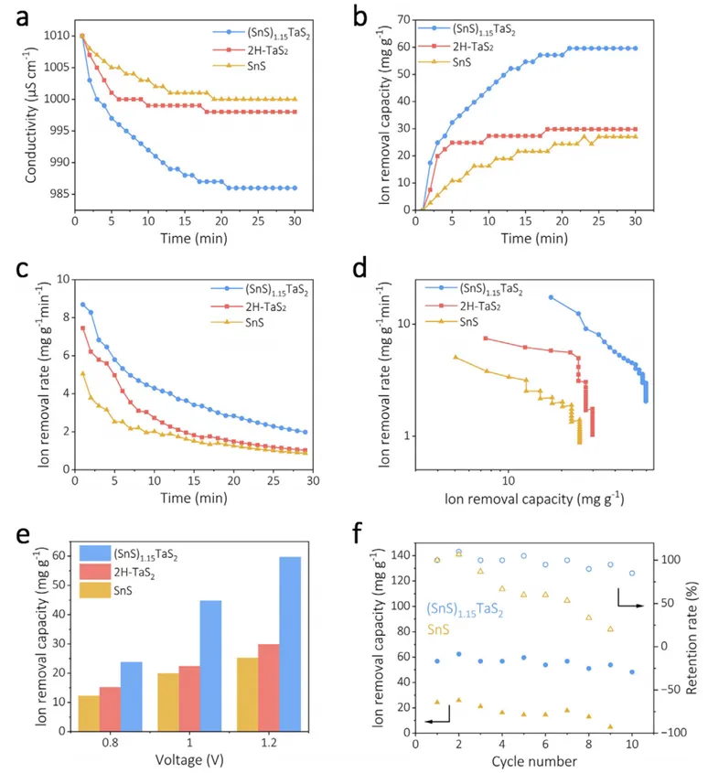 图5将(SnS)1.15TaS2的离子去除容量和离子去除速率与其他已报道的CDI电极材料进行了比较。该图旨在展示(SnS)1.15TaS2超晶格电极在可比条件下的性能水平。图示结果表明,(SnS)1.15TaS2的性能位居已报道的二维电极材料前列,凸显了其在CDI实际应用中的巨大潜力。其优异的脱盐性能归因于几个方面:通过超声辅助液相剥离获得的少层纳米片提供了可及的二维离子传输通道;1H-TaS₂亚层构成了高导电框架,增强了超晶格的结构韧性和电导率,从而加速了电荷转移动力学;交替结构确保每层SnS被1H-TaS₂本征包裹,缓解了重复循环中体积膨胀和收缩产生的机械应力。