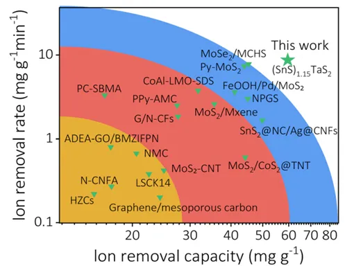 图5 SnS1.15TaS2与其他已报道CDI材料的离子去除能力及离子去除率比较。